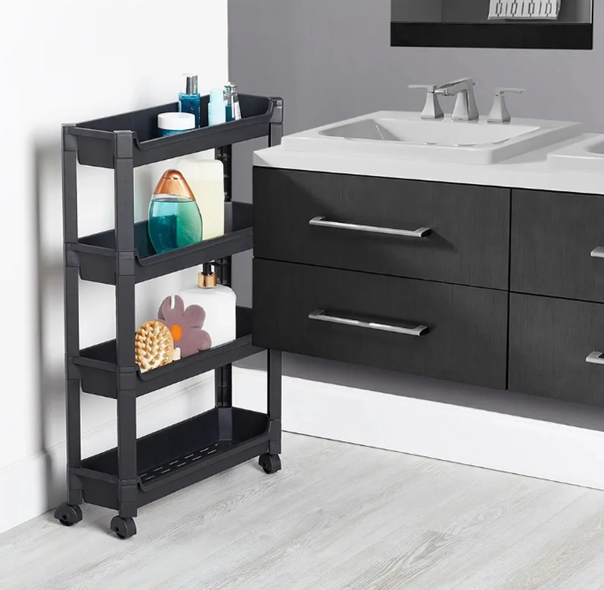 Dit reuze handige 4-laagse rek is slechts 14.5 cm breed en past daardoor op plekken die anders loos zouden zijn. Erg praktisch in de keuken, badkamer, schuur, slaapkamer…. Gemakkelijk schoon te maken en uiteraard bestendig tegen vocht en schimmel. Het rek heeft een draagvermogen van 30 kg.