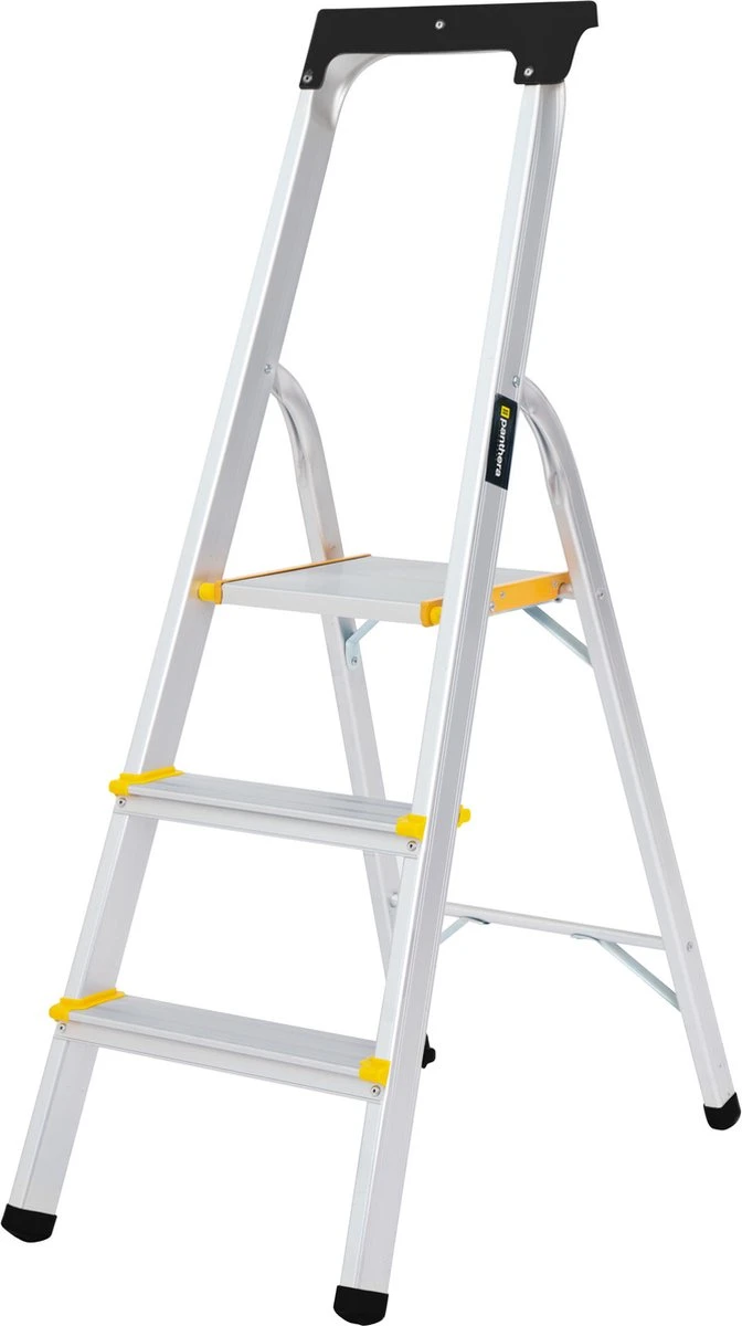Wie kent de enkele huishoudtrap niet? De bekende bordestrap die in ieder huishouden te vinden is. De hoogste treden, ook wel het bordes genoemd, is extra groot waardoor de gehele voet op het bordes past. Dit biedt meer sta comfort. Bovenin de beugel zit een klein gereedschapsbakje voor kleine gereedschappen. Handig om niet steeds omhoog en omlaag te stappen om materialen te pakken en/of te wisselen.