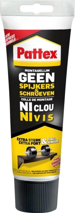 Pattex Geen Spijkers & Schroeven montagelijm. Bewijst dat klussen schoon, stil en eenvoudig kan zijn. De gemakkelijke oplossing om iets zonder te boren te monteren. Geen Spijkers & Schroeven Original is een oplosmiddelvrije lijm op waterbasis, die veilig te gebruiken is en zorgt dat de gewenste materialen binnen 10 seconden vast zitten.