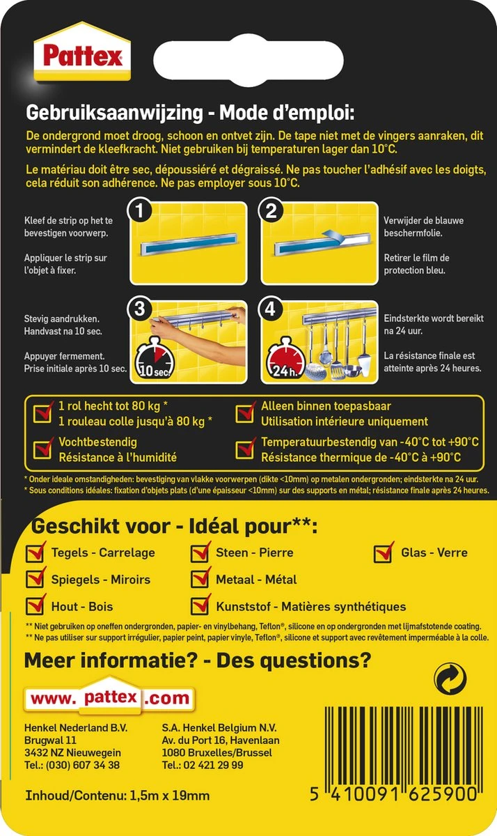 De dubbelzijdige tape is oplosmiddelvrij en geschikt voor poreuze en non-poreuze ondergronden. Omdat de tape waterbestendig is en 1 rol tot wel 80 kg kan verlijmen, biedt het betrouwbare en langdurige verbindingen. Klaar elke klus met deze direct-vaste, dubbelzijdige tape van Pattex.