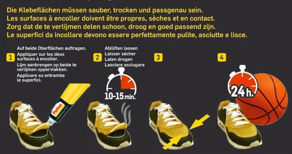 1. Zorg dat de oppervlakken schoon, droog, stof- en vetvrij zijn. Hoewel Pattex Special Schoen veel materialen kan verlijmen, is het product niet geschikt voor polyethyleen, polypropyleen en polystyreenschuim.