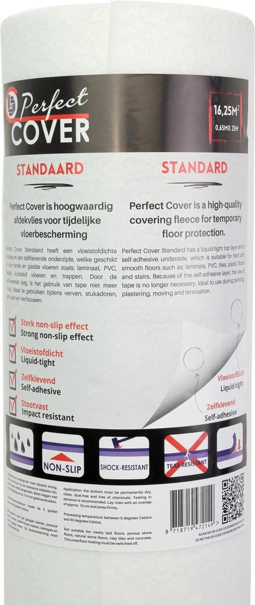 Perfect Cover Standaard heeft een vloeistofdichte toplaag en een zelfklevende onderzijde, welke geschikt is voor harde en gladde vloeren zoals: laminaat, PVC, tegels, kunststof vloeren en trappen. Perfect Cover biedt uitstekende vloerbescherming tijdens schilderen, stukadoren, renoveren en (ver)bouwen. Perfect Cover houdt uw vloer vrij van vocht, vuil, krassen en deuken.