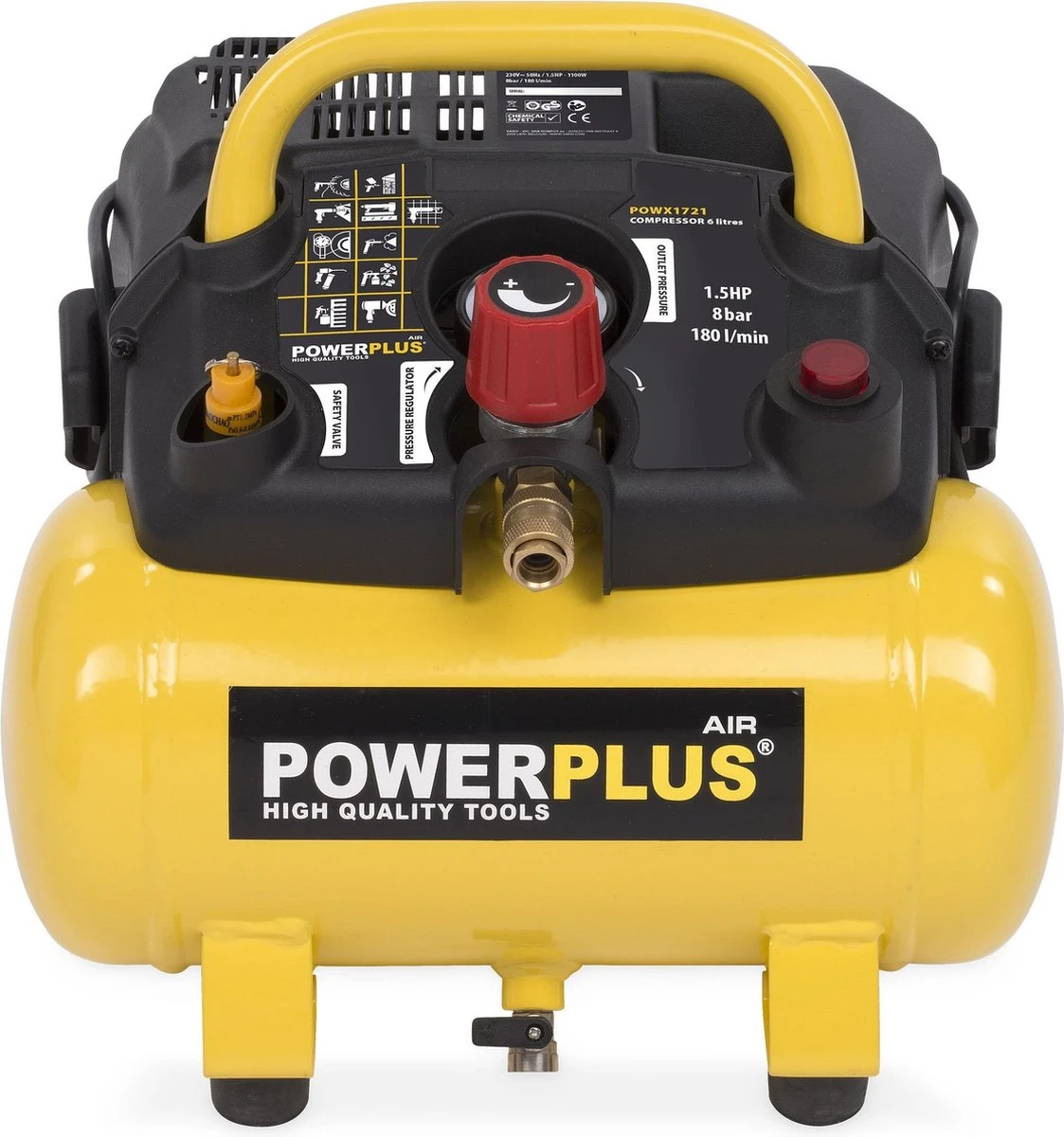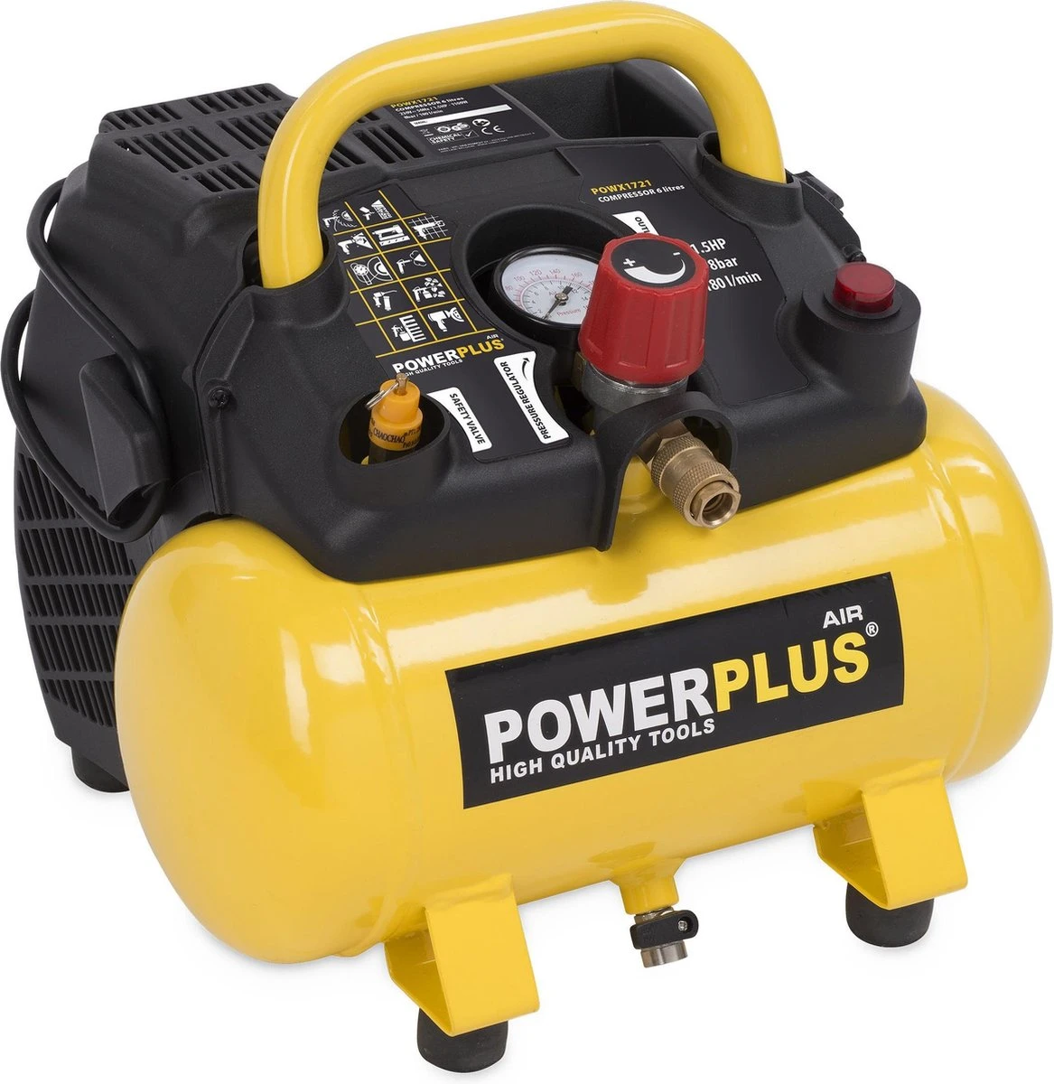 Deze draagbare, olievrije compressor is erg compact en licht. Hij heeft een kleine tank van 6 liter en weegt minder dan 10 kilo. Dit maakt hem gemakkelijk te verplaatsen naar daar waar je hem nodig hebt.