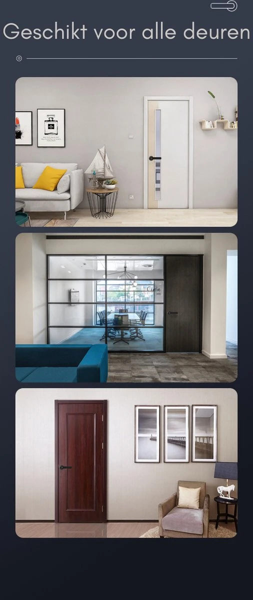 Het is makkelijk te installeren. Je krijgt alle benodigdheden erbij. Verder hoef je geen nieuwe deur voor aan te schaffen, want je kan gebruik maken van de cilinders die al in je huidige deur zitten. Past op deuren met een dikte van 30 tot 65 mm.
