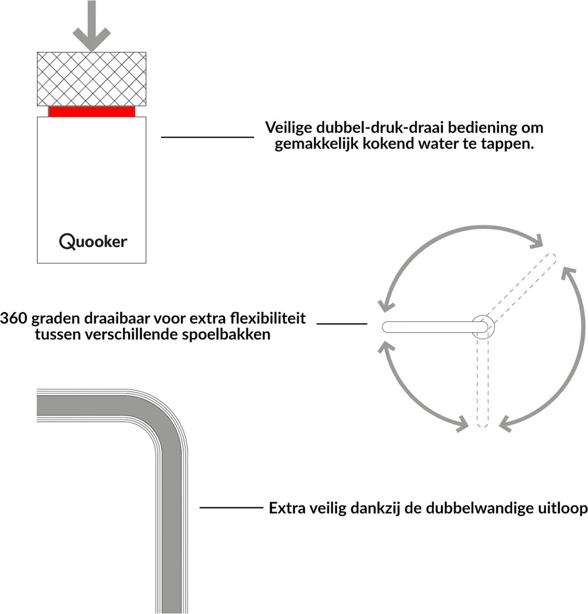 De kokend water- en mengkraan zijn gecombineerd in de Flex, de eerste heetwaterkraan voorzien van een flexibele uittrekslang! De flexibele uittrekslang zorgt ervoor dat de kokend-water-toevoer direct gestaakt wordt. De keukenkraan is uitgevoerd met een extra kindveilige (dubbel)druk-draai bedieningsknop en een lichtindicator bij de bedieningsknop welke bijgeleverd wordt met een PRO3-VAQ boiler. Deze Quooker Flex betreft het chrome model.
