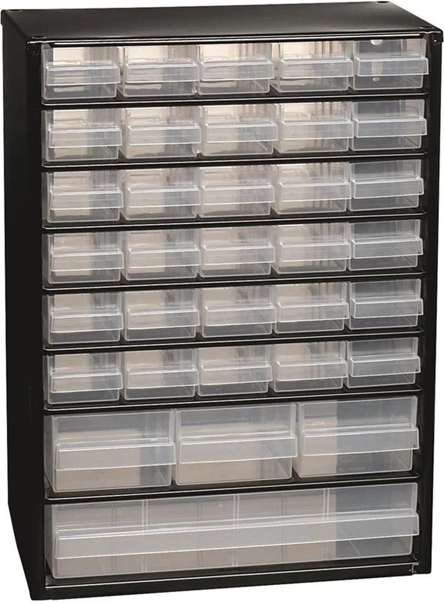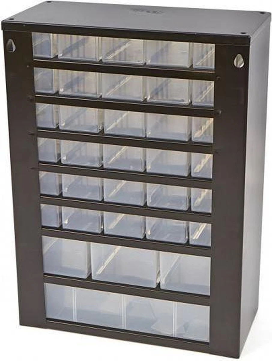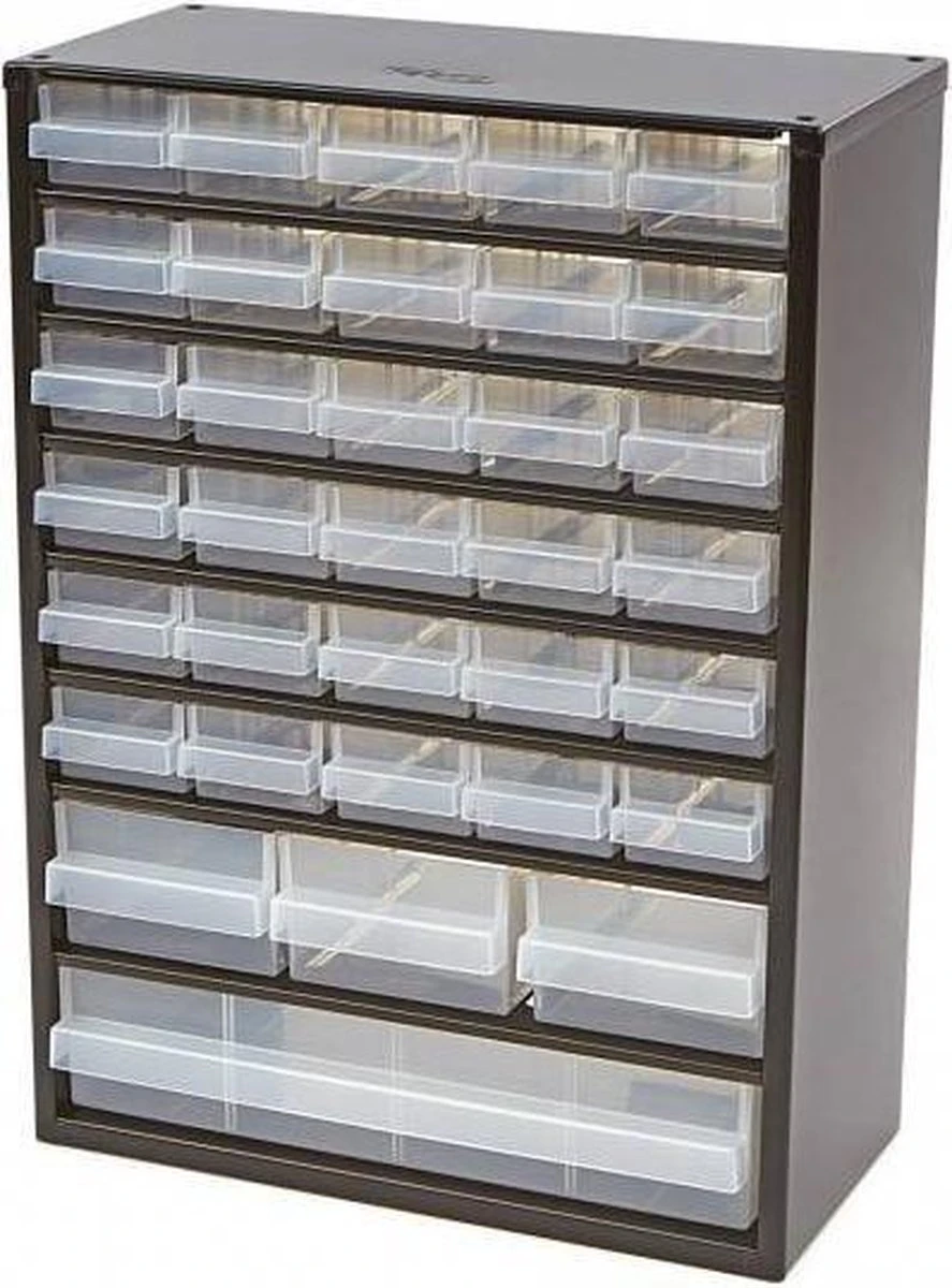 Stevige metalen ladekast van Raaco met 34 polypropyleen laden. Er worden 10 tussenschotten meegeleverd voor de kleine laden zodat je deze naar wens kunt indelen. De ladenbakjes zijn transparant zodat je in een oogopslag ziet wat er in zit. De ladekast is geschikt voor muurbevestiging en is eenvoudig te monteren aan de wand. Ideaal voor in de werkplaats of hobbyruimte voor het opbergen van kleinere materialen zoals schroeven, pluggen en spijkers.