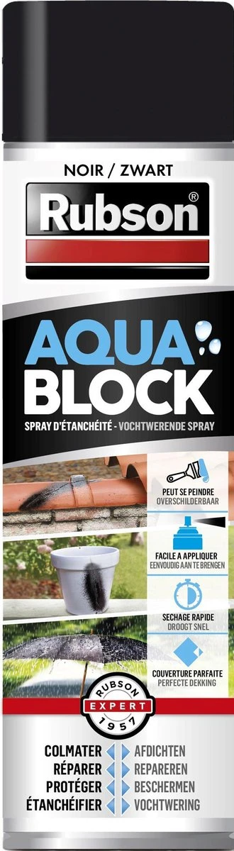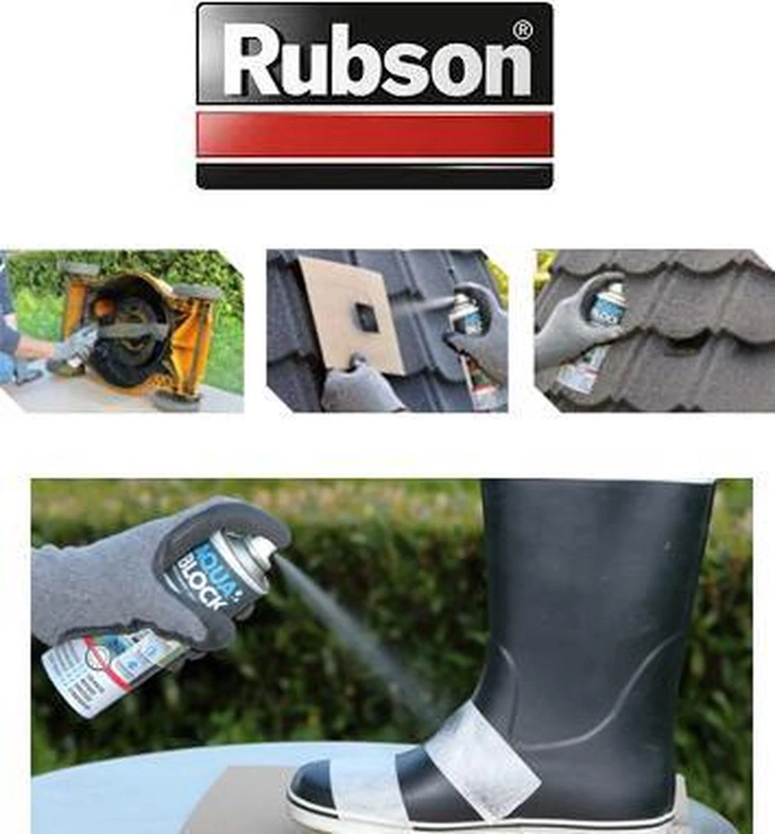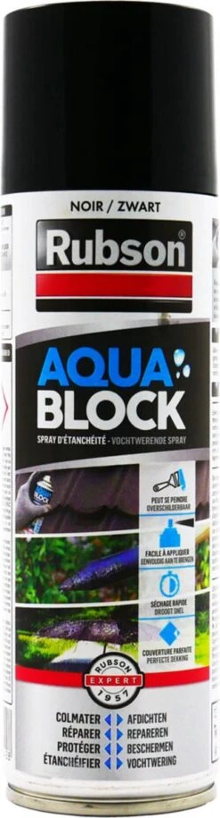 Rubson Aquablock Spray is een beschermende rubberen coating die kan worden gebruikt om lekkages en scheuren af te dichten.