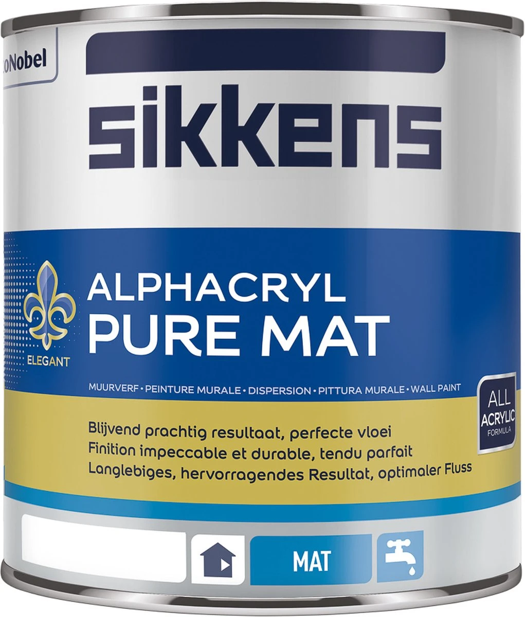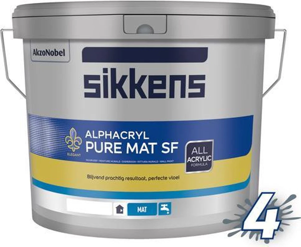 Alphacryl Pure Mat SF is een extreem matte, schrobvaste, oplosmiddelvrije binnenmuurverf. Door de matte eigenschap is de verf uitermate geschikt voor ruimten met invallend strijklicht. De matte uitstraling voorkomt dat er glans ontstaat door het licht dat naar binnen valt. Een hoogwaardig product van Sikkens dat zich bovendien makkelijk laat schoonmaken. Dat betekent dat je er goed gebruik van kunt maken in de woonkamer, de keuken en zelfs in ruimten waar gewerkt wordt.