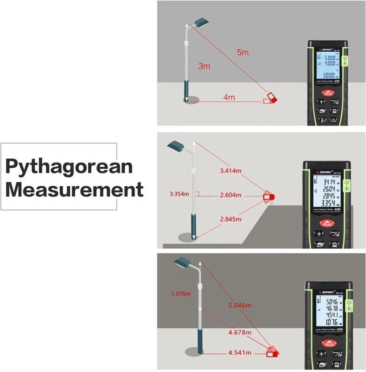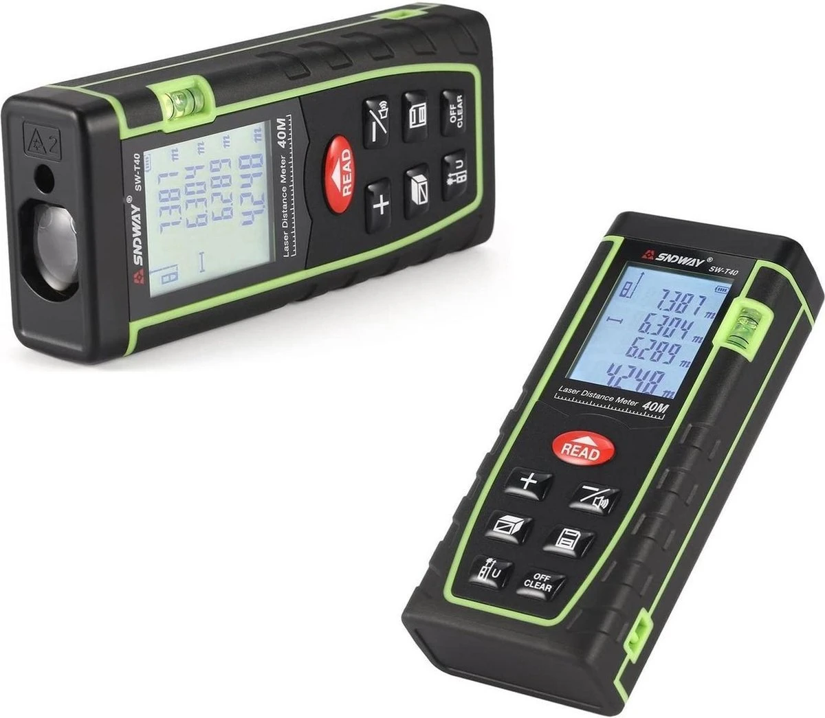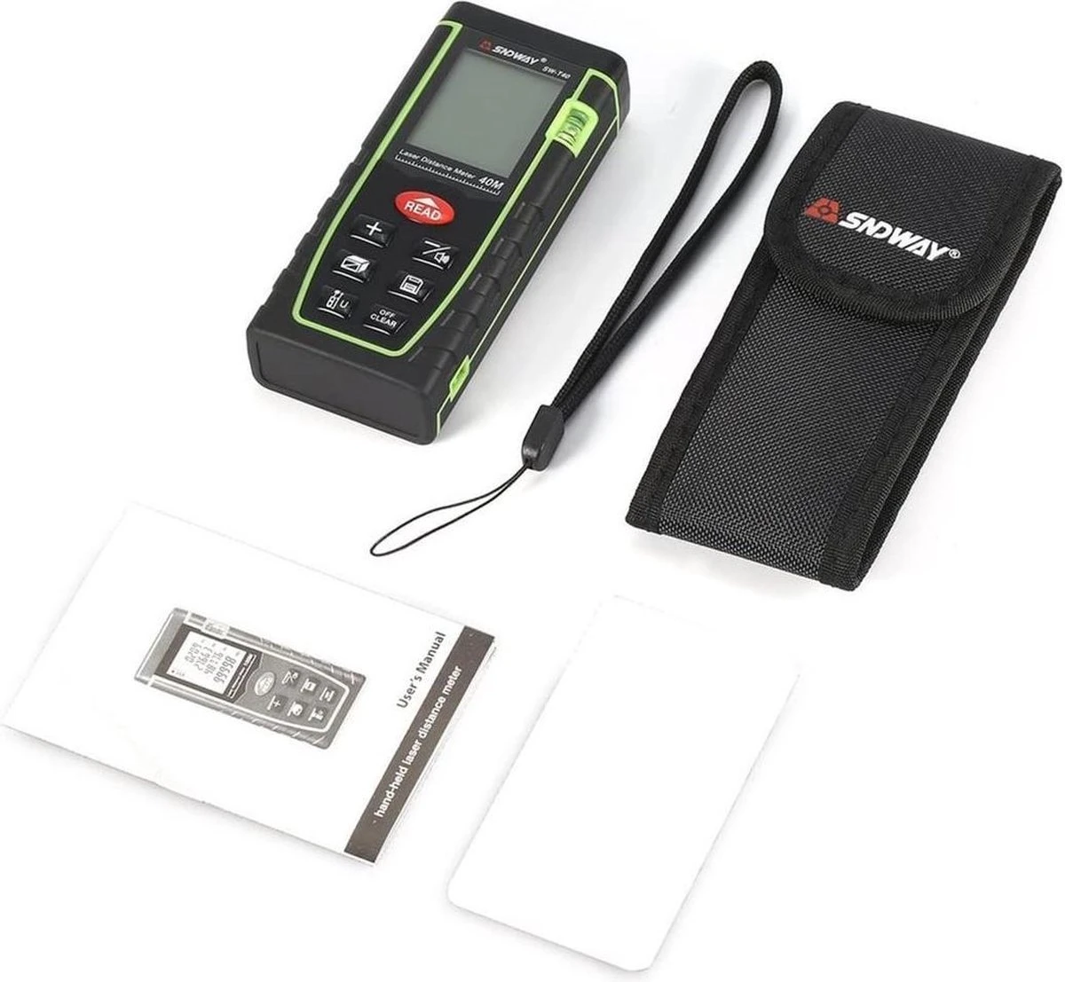 Dit professionele meetinstrument van SNDWAY ondersteunt oppervlakte, afstand, volume, continue meting, optellen / aftrekken en indirecte pythagoras-meting. Met een simpele druk op de “read” knop wordt de laser geactiveerd en begint de laser met meten. Door het grote LCD scherm met achtergrondverlichting kan de gebruiker informatie in donkere gebieden met een betere resolutie aflezen. Bovendien maakt het handige zakformaat het apparaat overal gemakkelijk te gebruiken.