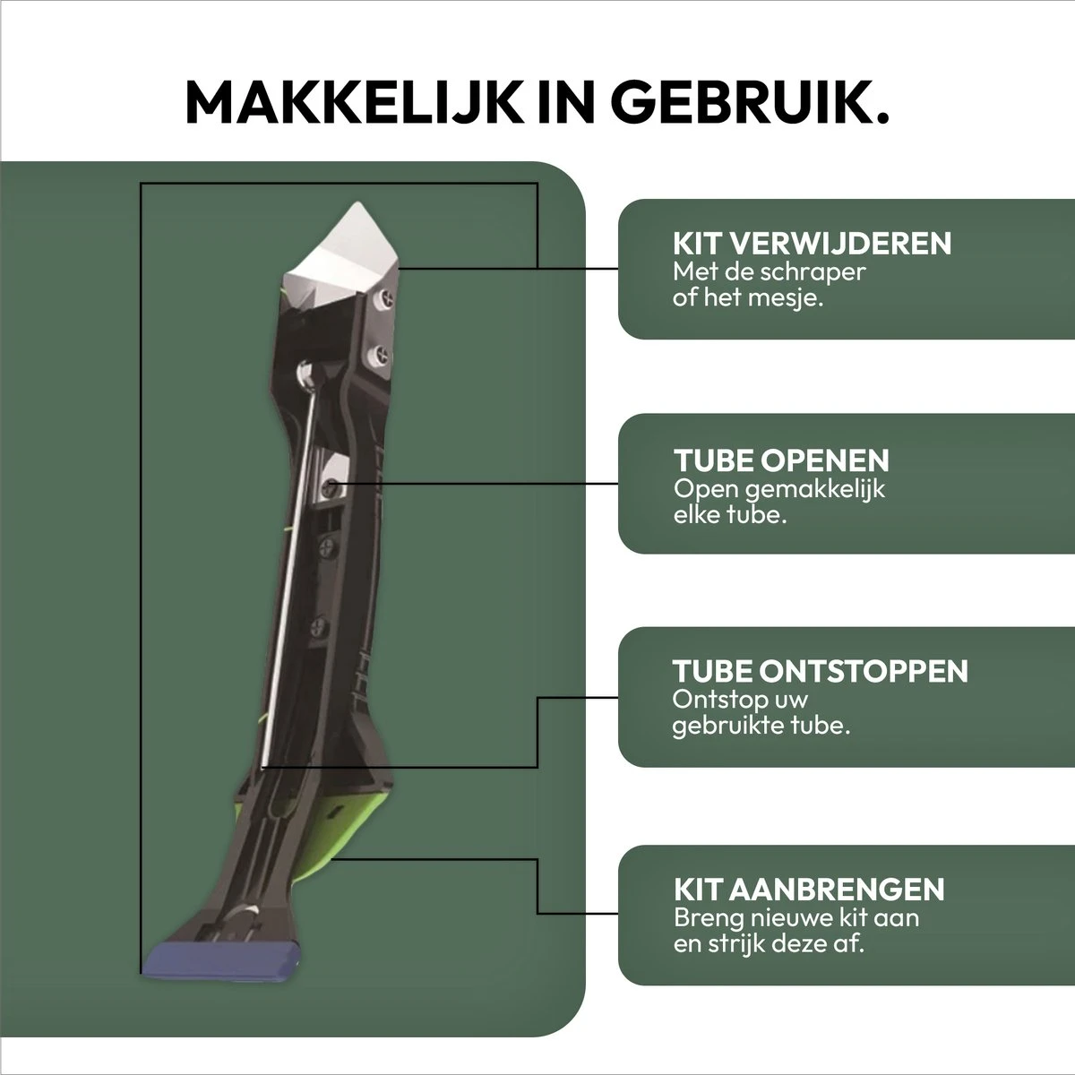 In vergelijking tot de STACK Kit Schraper 3 in 1, is deze STACK Kit Schraper 5 in 1 uitgerust met een speciale tool om een gebruikte kit tube te ontstoppen. Zo is de tube weer direct klaar voor gebruik. Ook is de 5 in 1 variant voorzien van een scherp mesje om gemakkelijk nieuwe kit tubes open te maken. Kortom; zeker de upgrade waard!