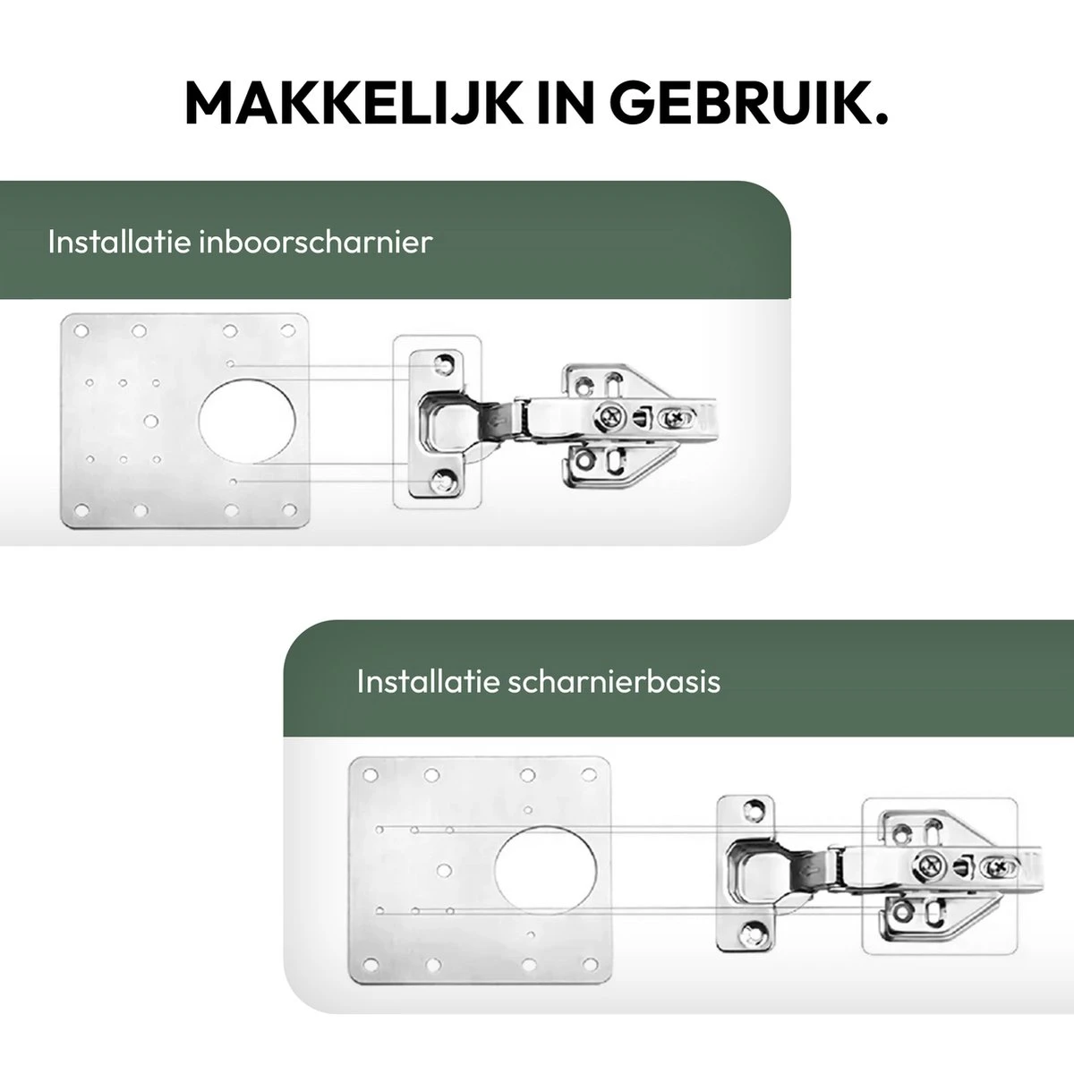 Komt uw scharnier los uit het materiaal waar deze in bevestigd zit? Dan heeft u vaak een probleem. Door de slijtage van het hout of een ander materiaal is het niet mogelijk de scharnier opnieuw stevig vast te zetten. De STACK Scharnier Reparatie Plaat biedt echter de oplossing!