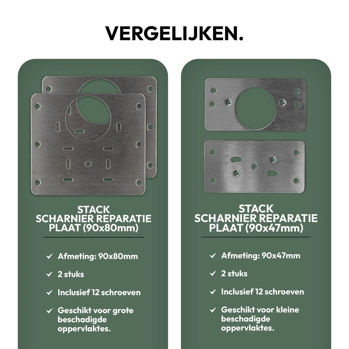 Door middel van de STACK Scharnier Reparatie Plaat creeert u een nieuwe ondergrond om uw scharnier stevig op vast te zetten. Het duurzame RVS materiaal, in combinatie met de voorgeboorde en getapte schroefgaten, zorgt ervoor dat de reparatie plaat gemakkelijk te plaatsen is en de juiste stevigheid biedt. De schroeven hiervoor worden meegeleverd! Alle gaten zijn zo voorgeboord dat de reparatie plaat voor elke scharnier geschikt is.