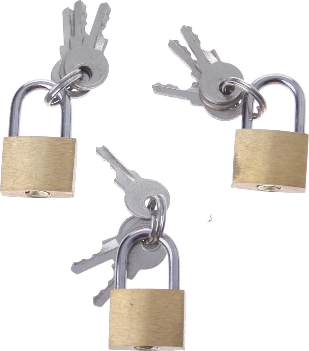 Drie hangsloten van 20 mm. Perfect om een kistje of iets anders kleins mee op slot te zetten. Deze sloten zijn niet gelijksluitend.