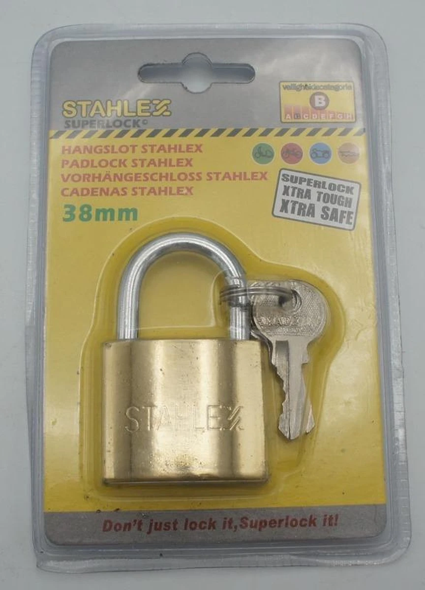 Zoekwoorden: Hangslot, Superlock, Inclusief 3 sleutels, Veiligheidscategorie B, Automatisch sluitend, Geharde stalen beugel, 38 mm.