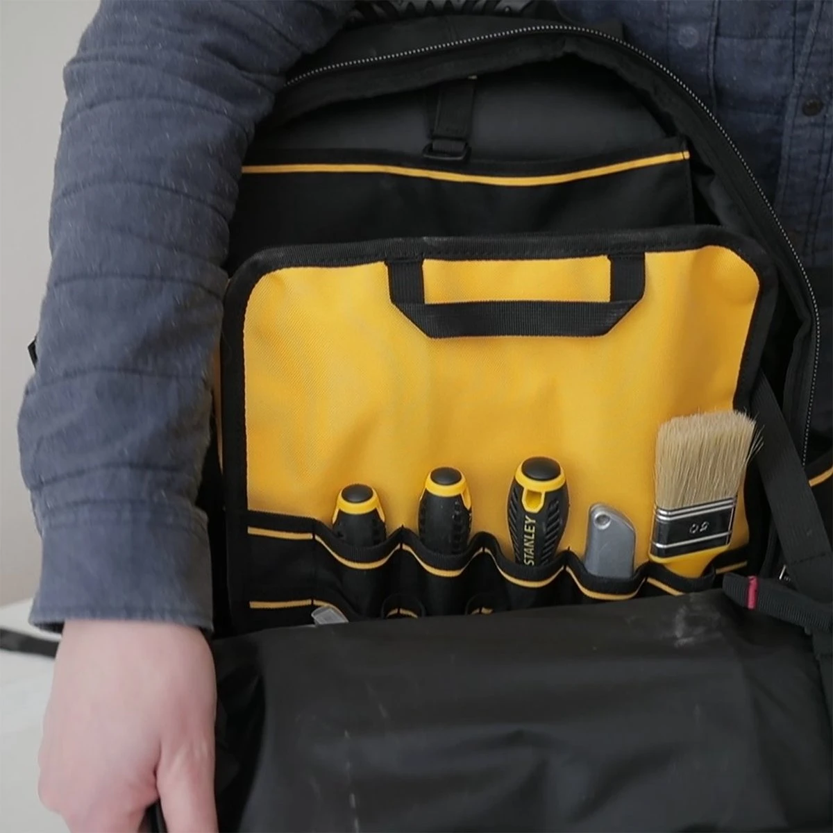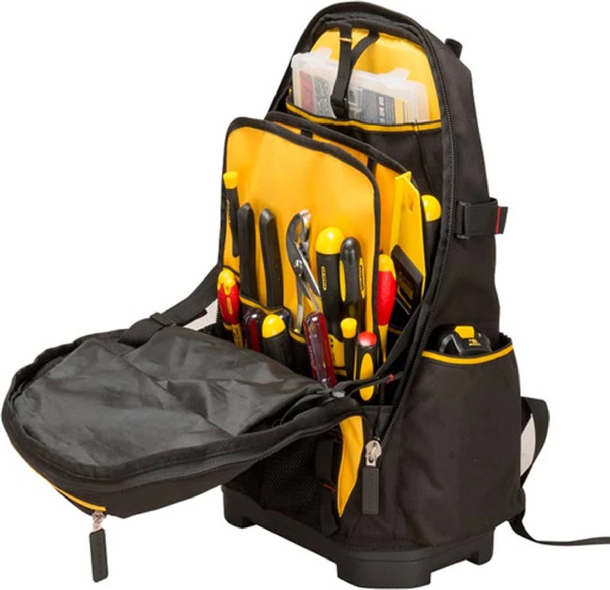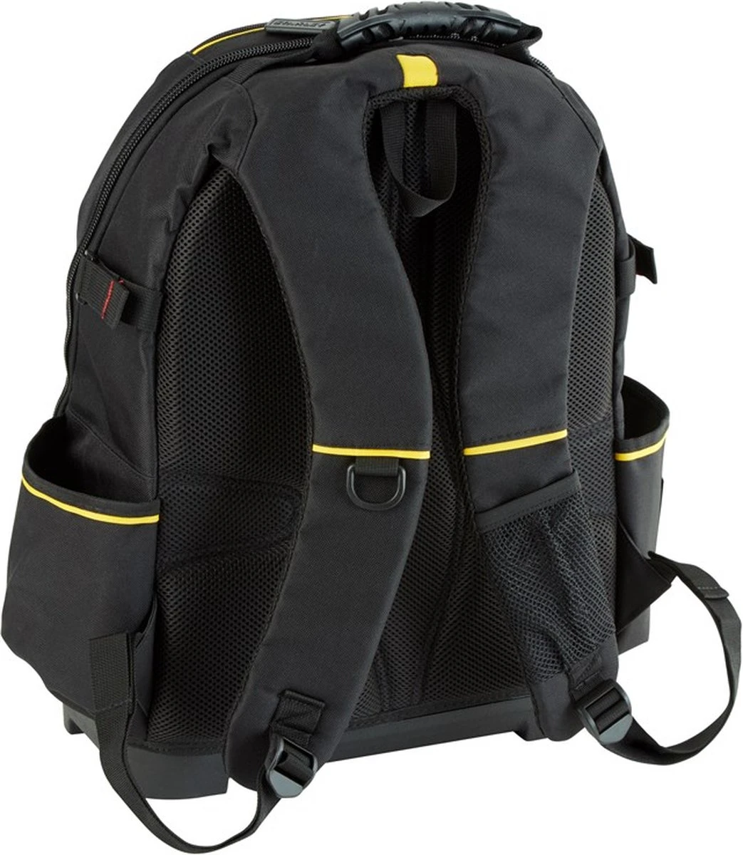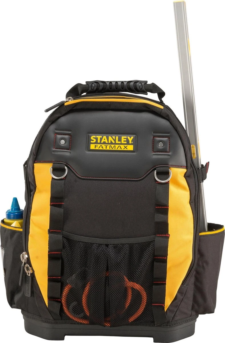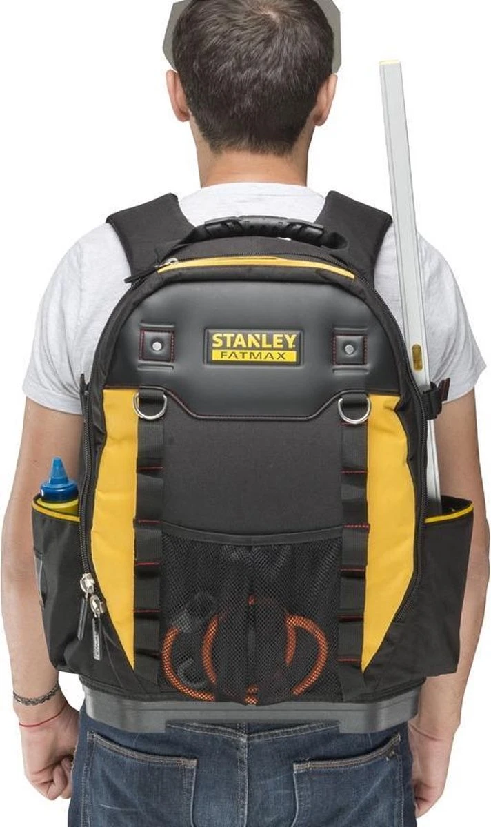 STANLEY FatMax 1-95-611 Gereedschapsrugzak beschikt over een verstevigd frame dit zorgt er voor dat de rukzag zowel gesloten als open rechtop blijft staan, zodat het gereedschap makkelijk toegankelijk is. Afzonderlijk vak met extra beschermlaag voor een laptop of elektrisch gereedschap. Neem gereedschap veilig en handenvrij mee met deze STANLEY FatMax gereedschapsrugzak.
