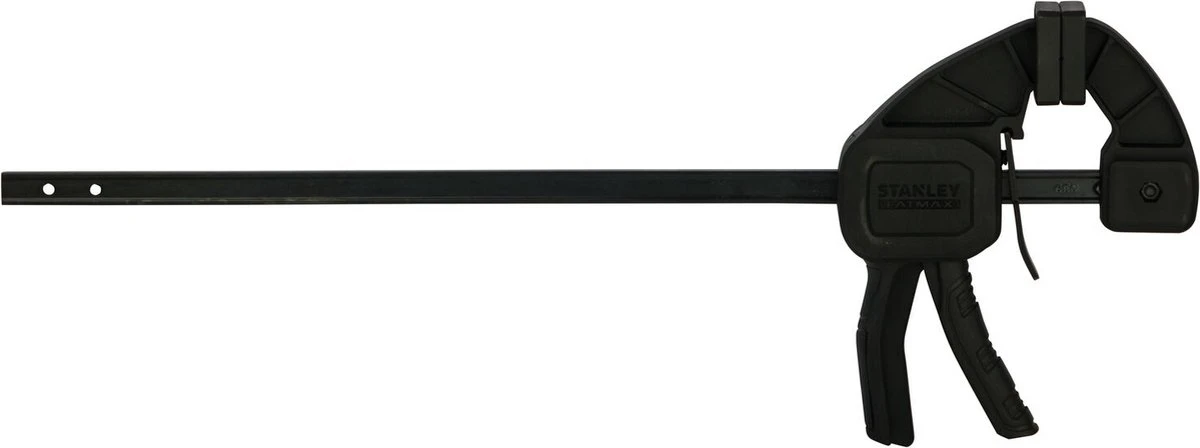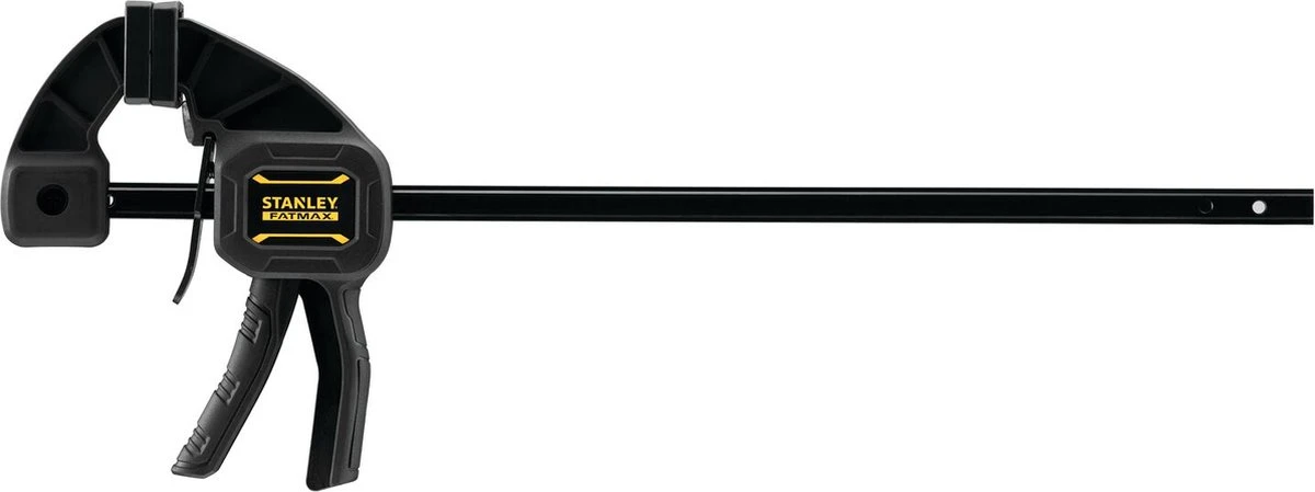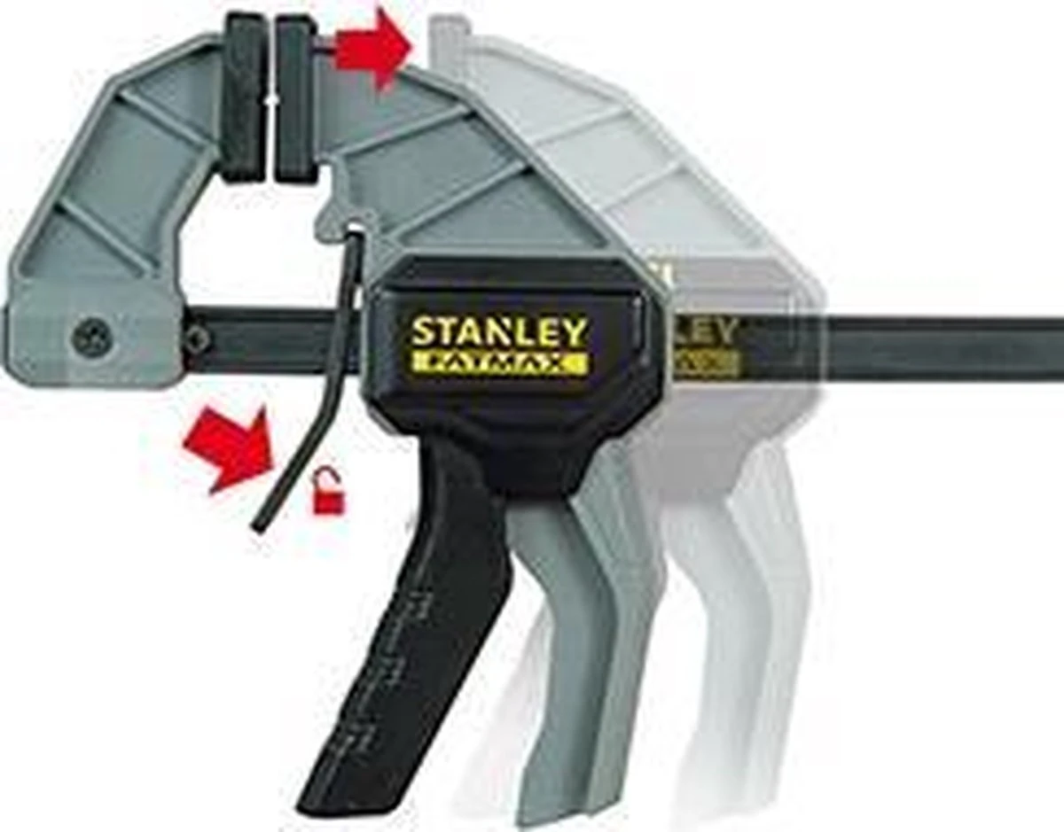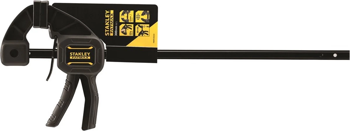 Deze Stanley Fatmax eenhandklem heeft een klemcapaciteit van 300 mm en een klemdiepte van 60 mm. De lengte is 472 mm. De eenhandklem heeft een handgreep met sterke hefboomwerking en een stalen kern voor een hoge klemkracht. De duurzame harsbehuizing zorgt voor stevigheid en voorkomt dat de klem gaat slippen. De klem heeft een gegoten ergonomische ontgrendeltrekker om de sterke klemming los te maken. De verwijderbare zachte bekken zorgen voor gelijkmatige druk bij het vasthouden of vastlijmen. De omkeerbare bek heeft een drukknopontgrendeling om snel om te kunnen schakelen naar een spreidtang.