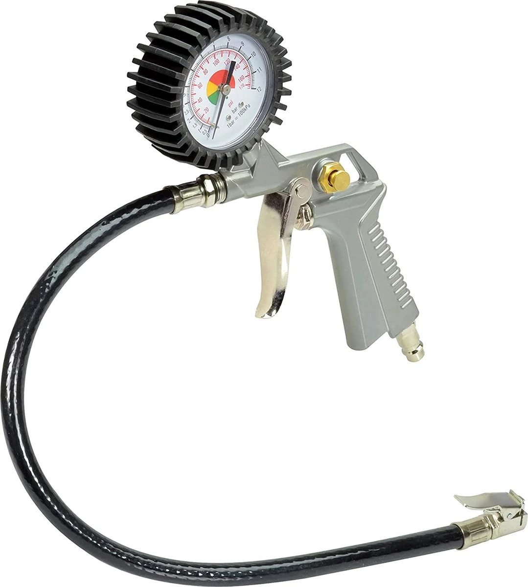 1 Bandenpomppistool met manometer en bijbehorende opzetstukken