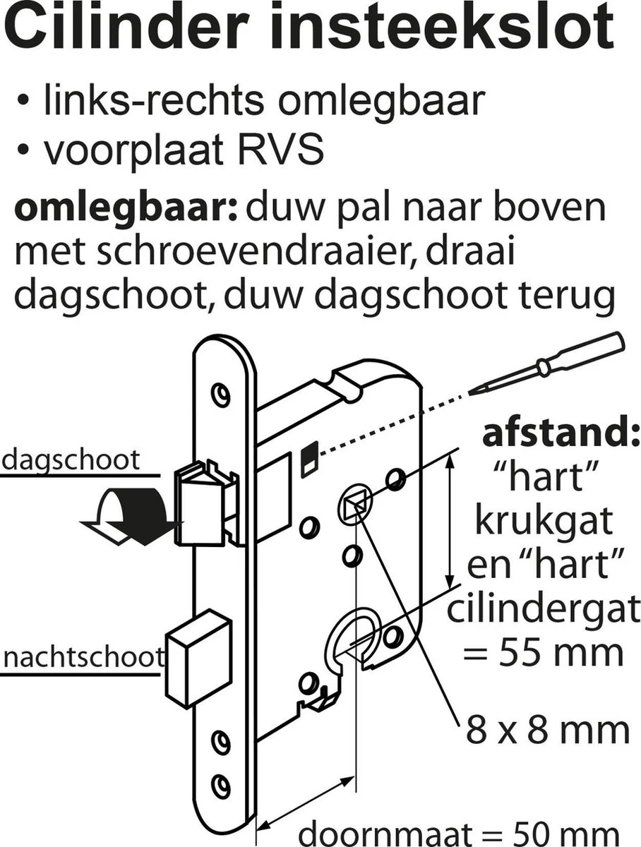 Dit slot is geschikt voor een breed scala aan deuren. Denk hierbij aan de deur van je voorraadkast of je slaapkamer. Gebruik dit Starx kamerdeurslot om je huidige slot te vervangen of voor installatie op nieuwe deuren. De hartafstand tussen krukgat en het hart van het cilindergat is 56 mm, de Nederlandse standaard. De dagschoot is omkeerbaar, zodat het slot zowel links– als rechts op jouw deur past. Voor de deurkozijnen wordt een bijpassende voorplaat (174×20 mm) meegeleverd, zodat je deur altijd mooi afgewerkt is.