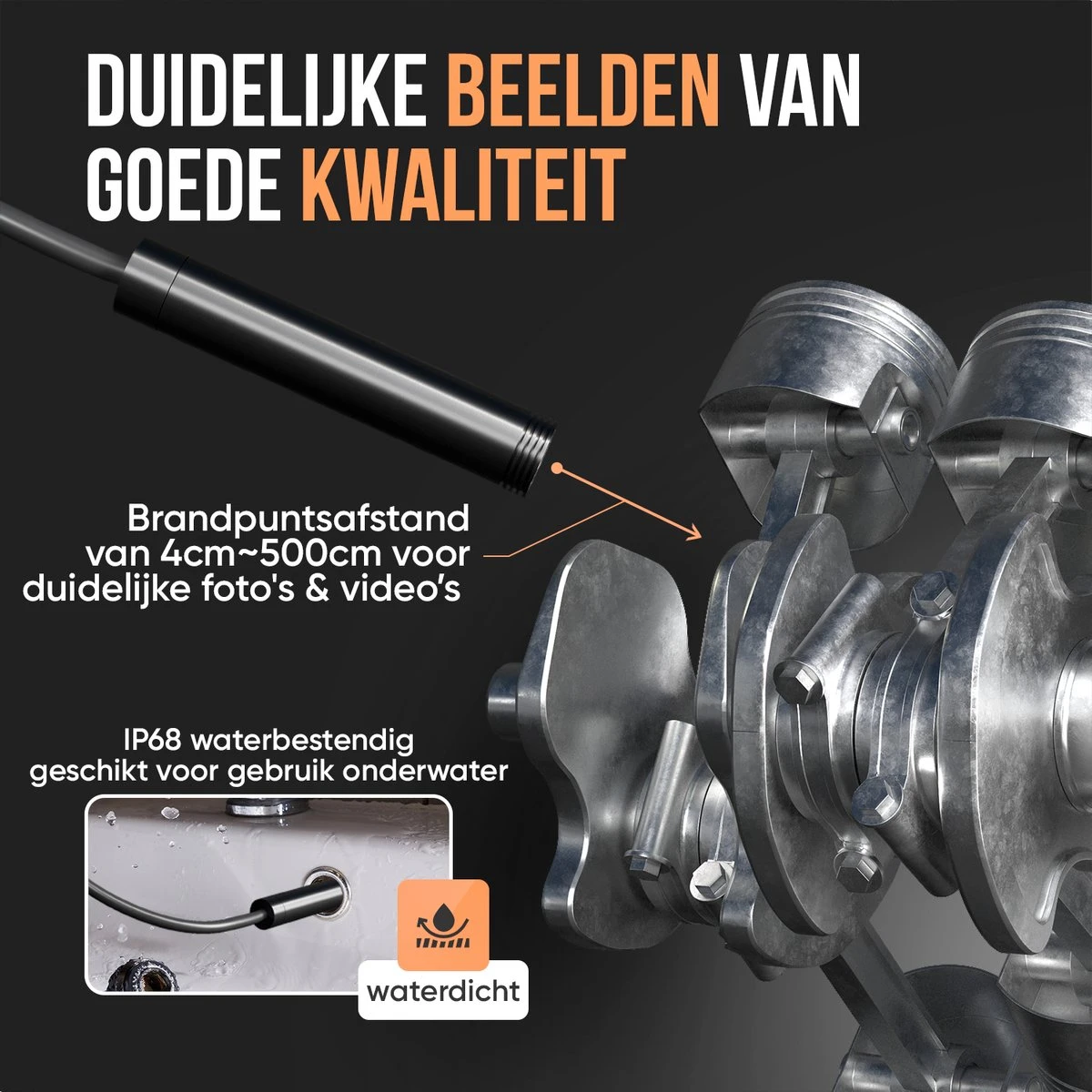 Deze slimme endoscoop heeft een IP67 water en stofbestendige kabel en cameralens. Perfect voor vochtige plaatsen. Snel een kijkje binnen de pijpleiding nemen? Met onze inspectiecamera is het geen probleem.