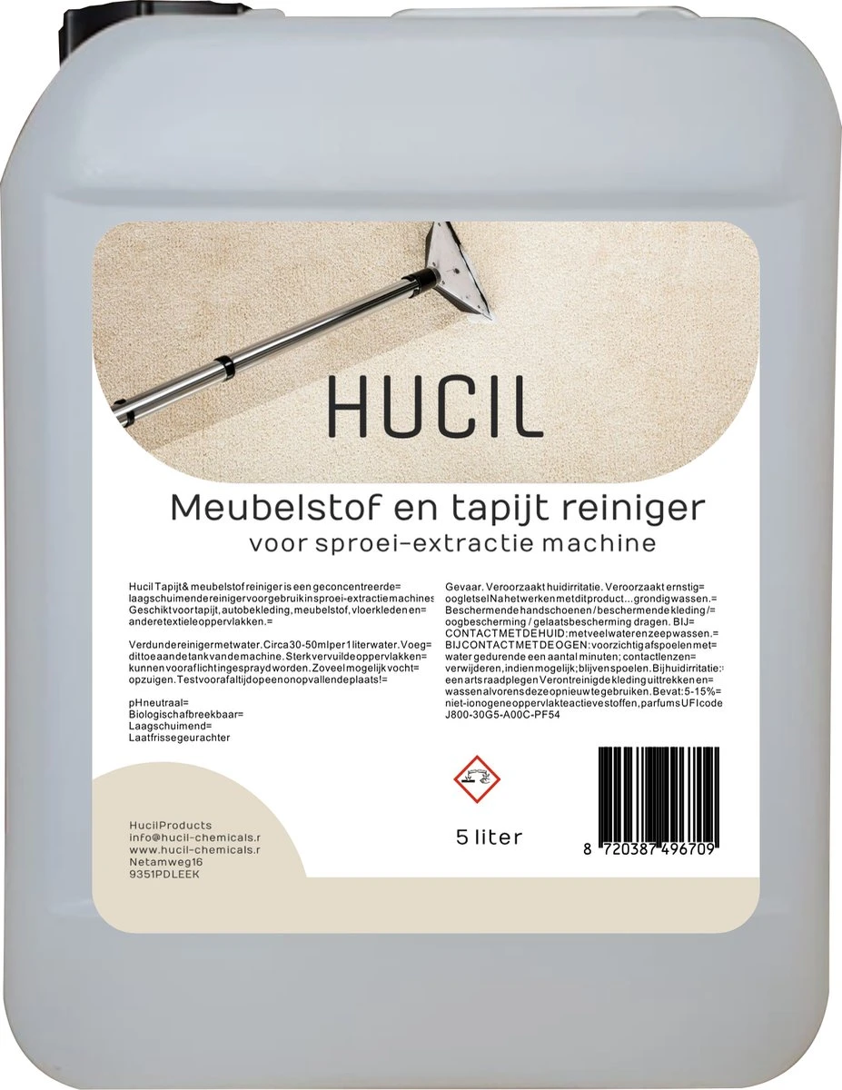 Hucil Tapijt & meubelstof reiniger is een geconcentreerde laagschuimende reiniger voor gebruik in sproei-extractie machines. Geschikt voor tapijt, autobekleding, meubelstof, vloerkleden en andere textiele oppervlakken.