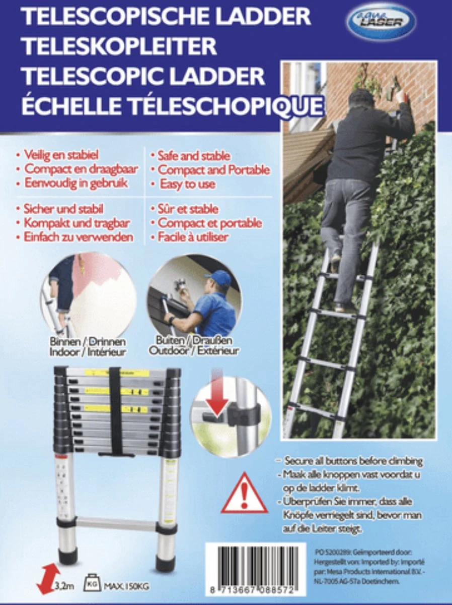 Stevige, robuuste ladder met 11 treden, uitschuifbaar tot een max. lengte van 3.2 meter. Voor binnen en buiten. Veilig en stabiel. Compact en draagbaar, lengte ingeklapt 79 cm. Belastbaar tot max. 150 kilo.