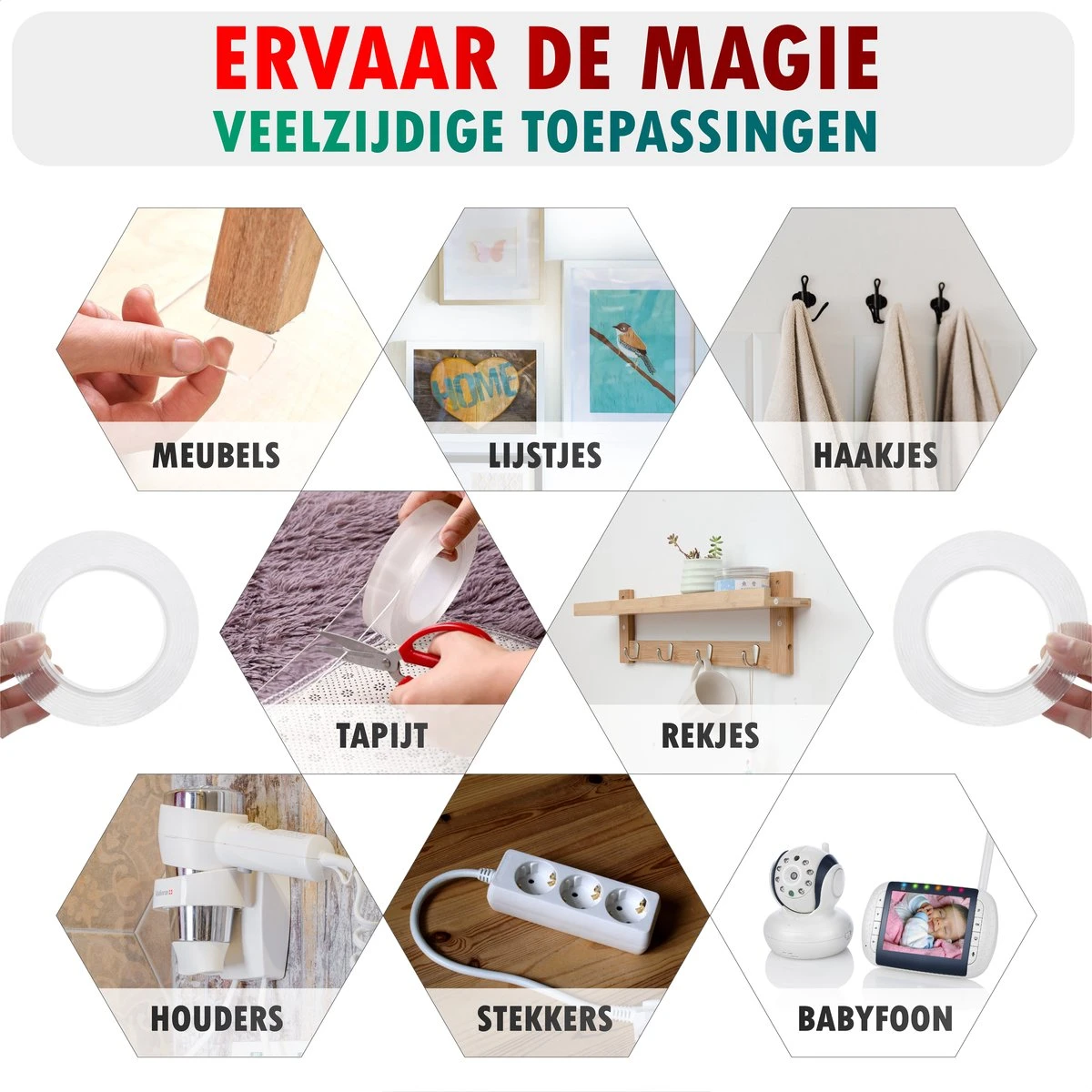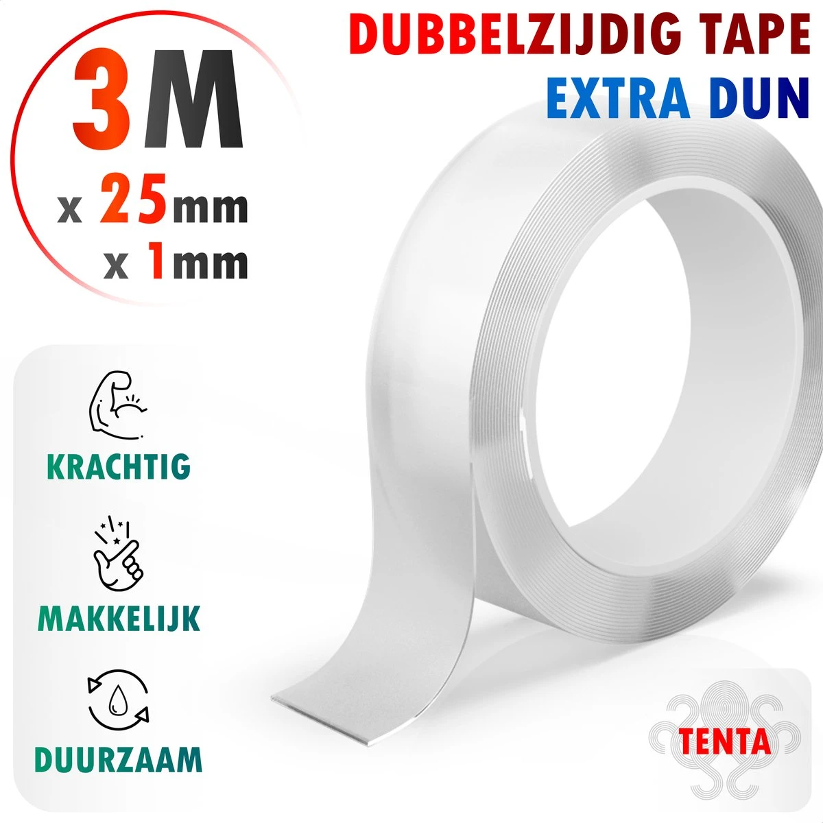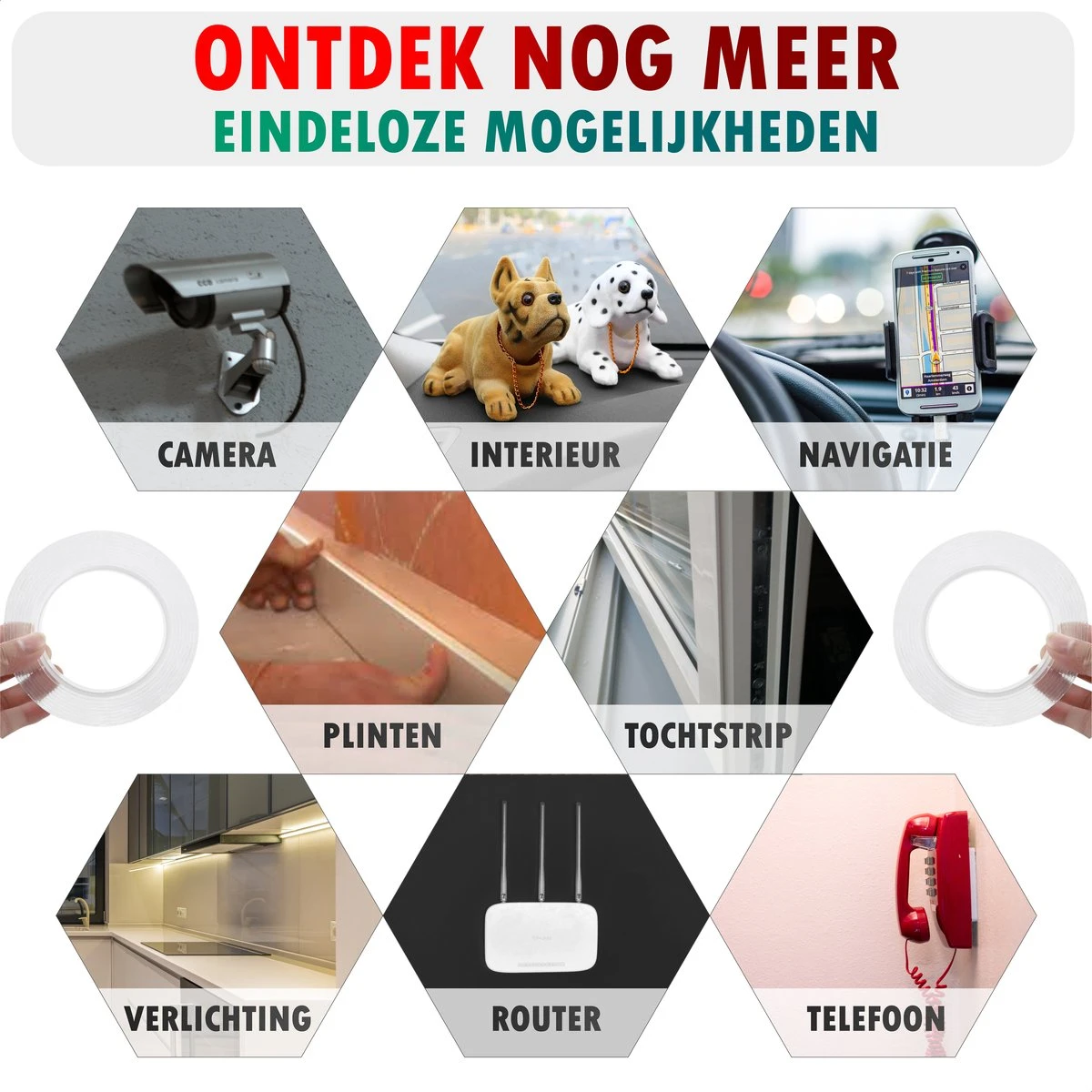 TENTA® Tape is Transparant, Herbruikbaar, Waterproof, Rekbaar, Super sterk en laat geen sporen achter. Met deze dubbelzijdige tape maak je gebruik van nano (suction) technologie. De werking is vergelijkbaar met de zuignappen van een octopus.