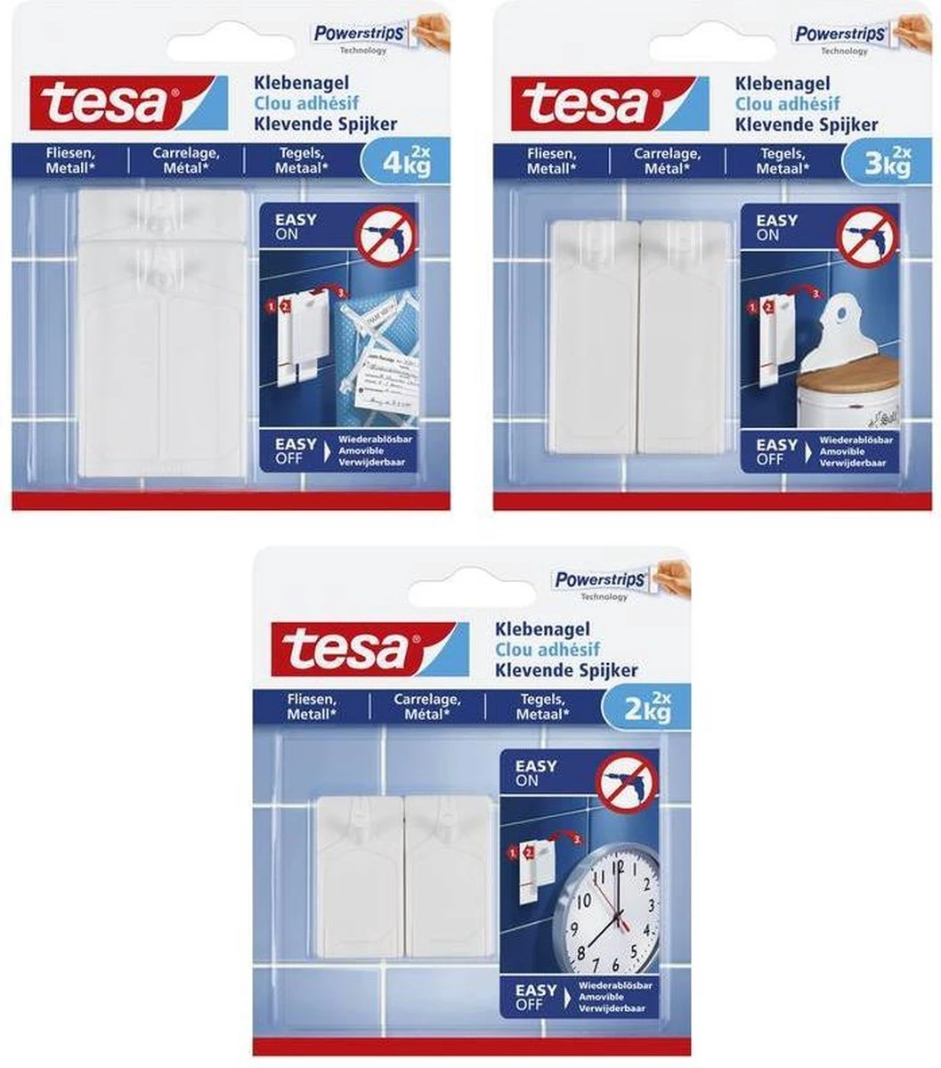 Deze Tesa Klevende Spijkers voor Tegels & Metaal hebben een draagkracht tot 2 kg per stuk en met als je er twee gebruikt, kunnen ze twee keer zoveel gewicht dragen. Ze zijn speciaal ontwikkeld voor gladde en harde oppervlakken zoals tegels, de meeste metalen oppervlakken en glas.