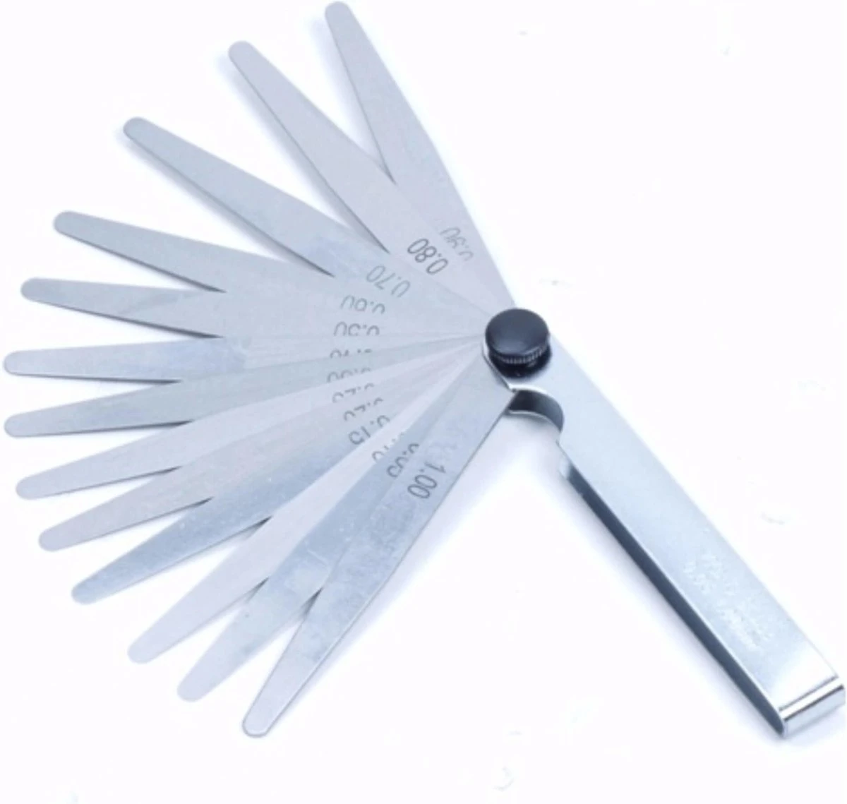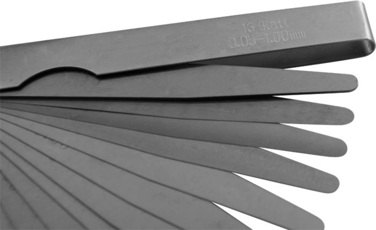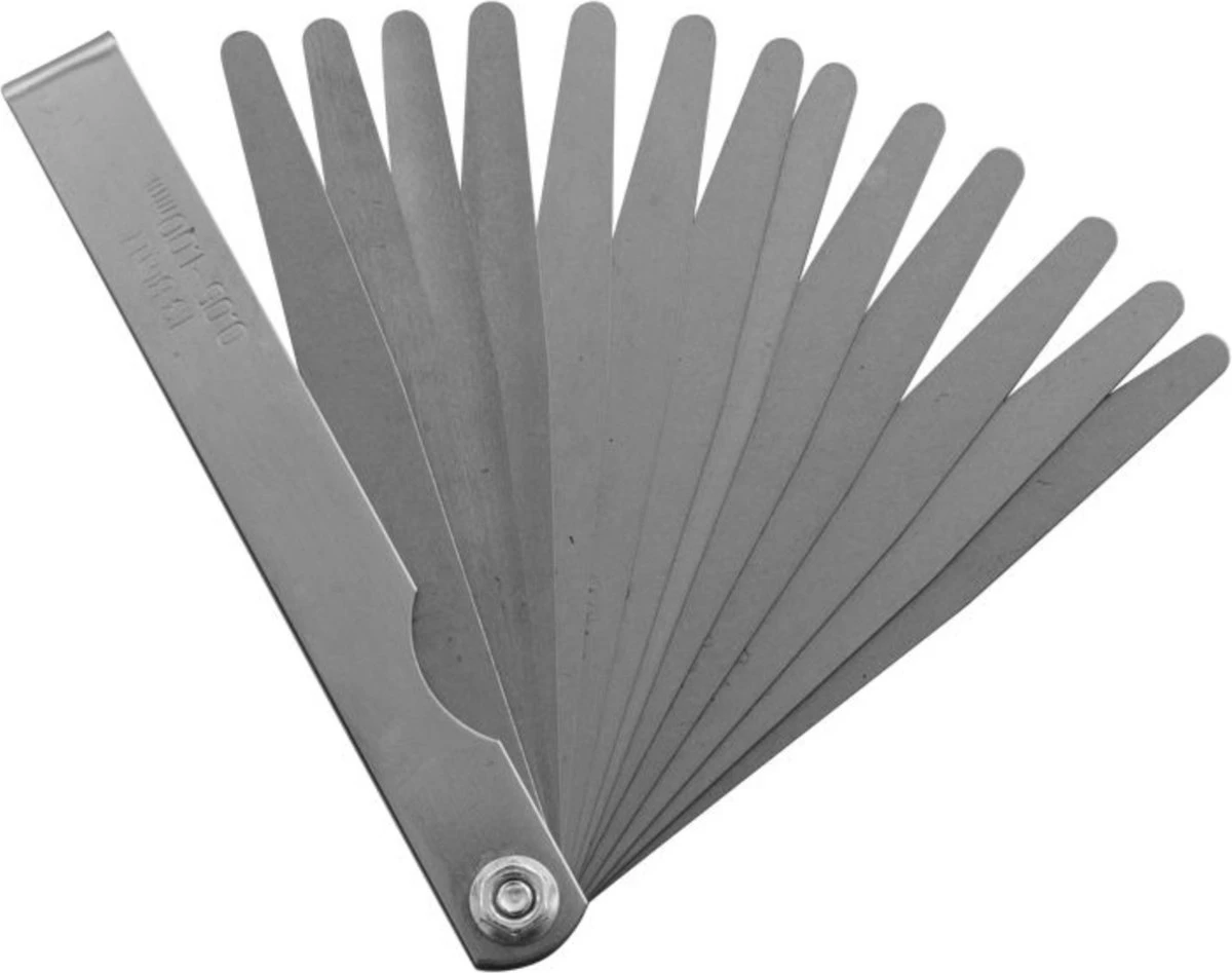 Handige voelermaat met 13 bladen in diktes oplopend van 0.05 naar 1.00 mm, verpakt in blister