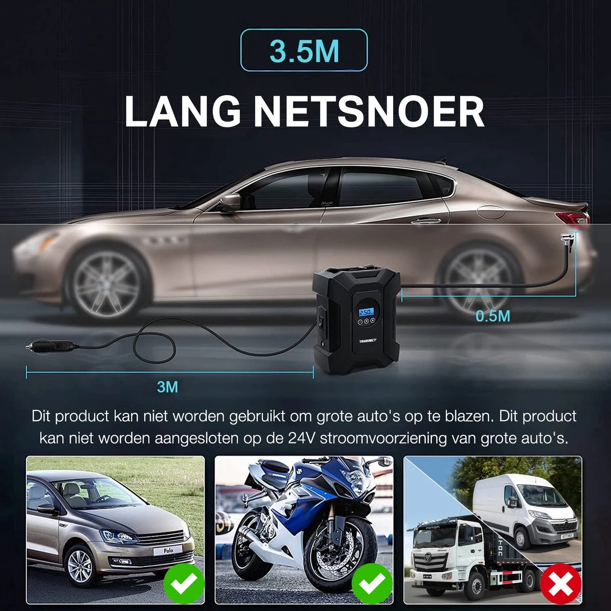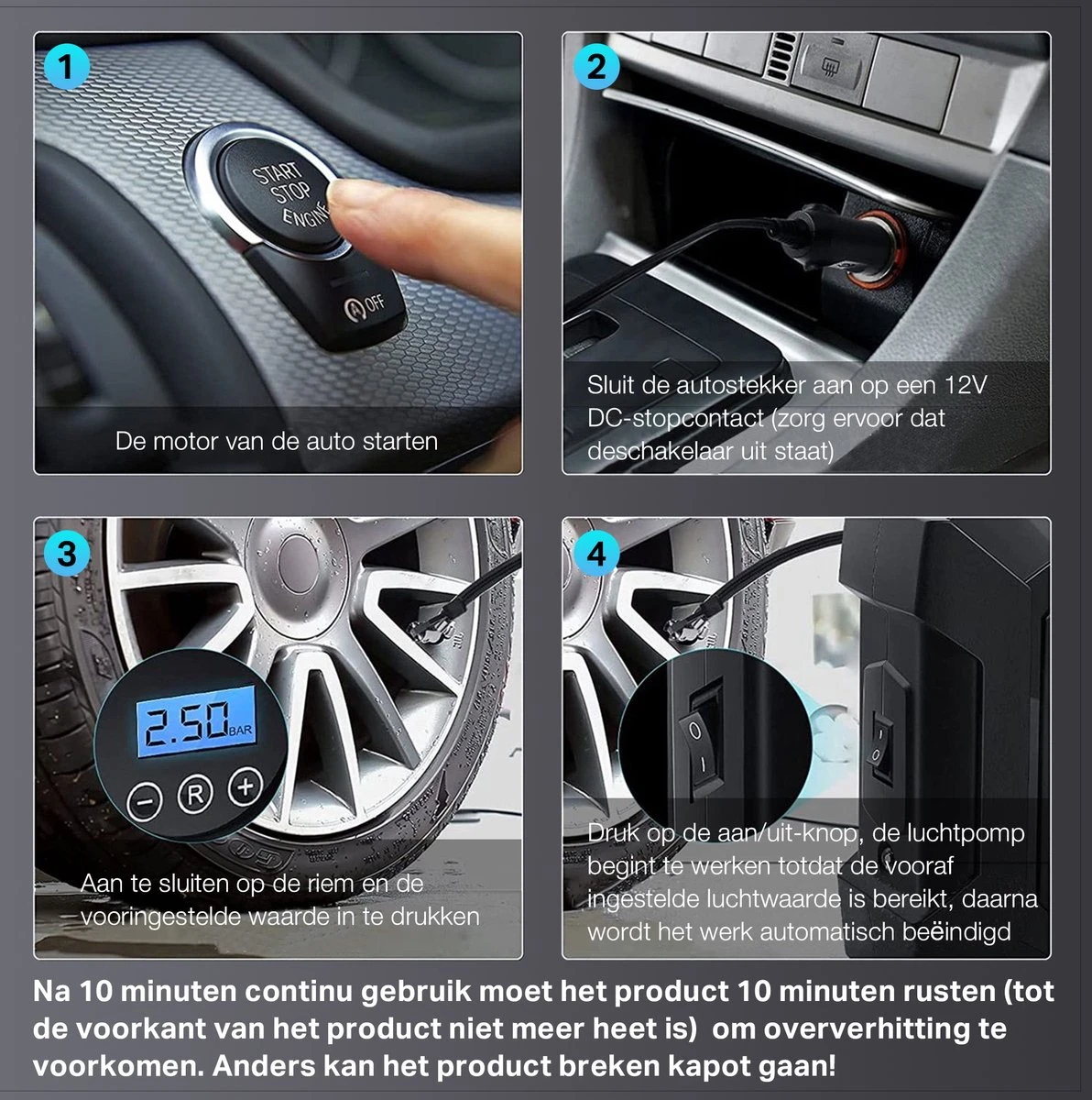 【EIGENSCHAPPEN】Een klik om de drukeenheden te wijzigen tussen PSI, KPA, BAR en KG/CM²; Groot, zeer nauwkeurig display maakt het zelfs in het donker gemakkelijk af te lezen; Superheldere automatische LED-zaklamp maakt onze auto-luchtpomp geschikt voor noodgevallen langs de weg en nachtelijk gebruik; Compatibel met alle voertuigen met DC-12V sigarettenaansteker. En (3 meter) sigarettenaanstekersnoer in de auto maakt het gemakkelijk te gebruiken.