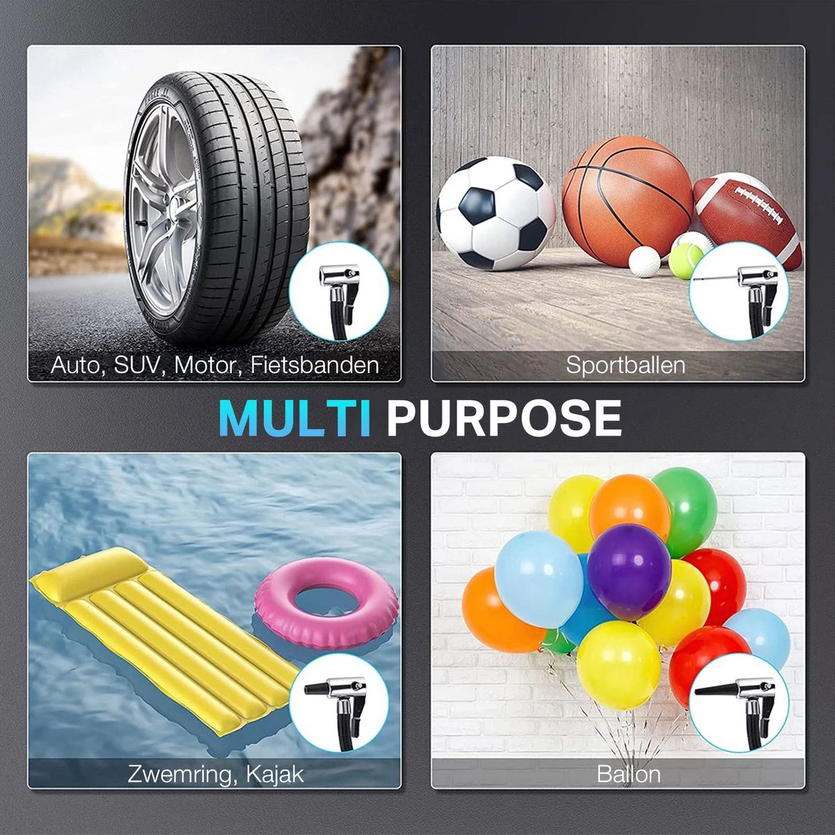 【MULTI-PURPOSE】De bandenpomp is perfect voor compacte of middelgrote sedans, SUV’s, ATV’s, motorbanden. Bevat drie mondstukken voor sportballen, luchtbed, zwembadspeelgoed en andere springkussens. Kan ook worden gebruikt als luchtpomp voor de fiets. .