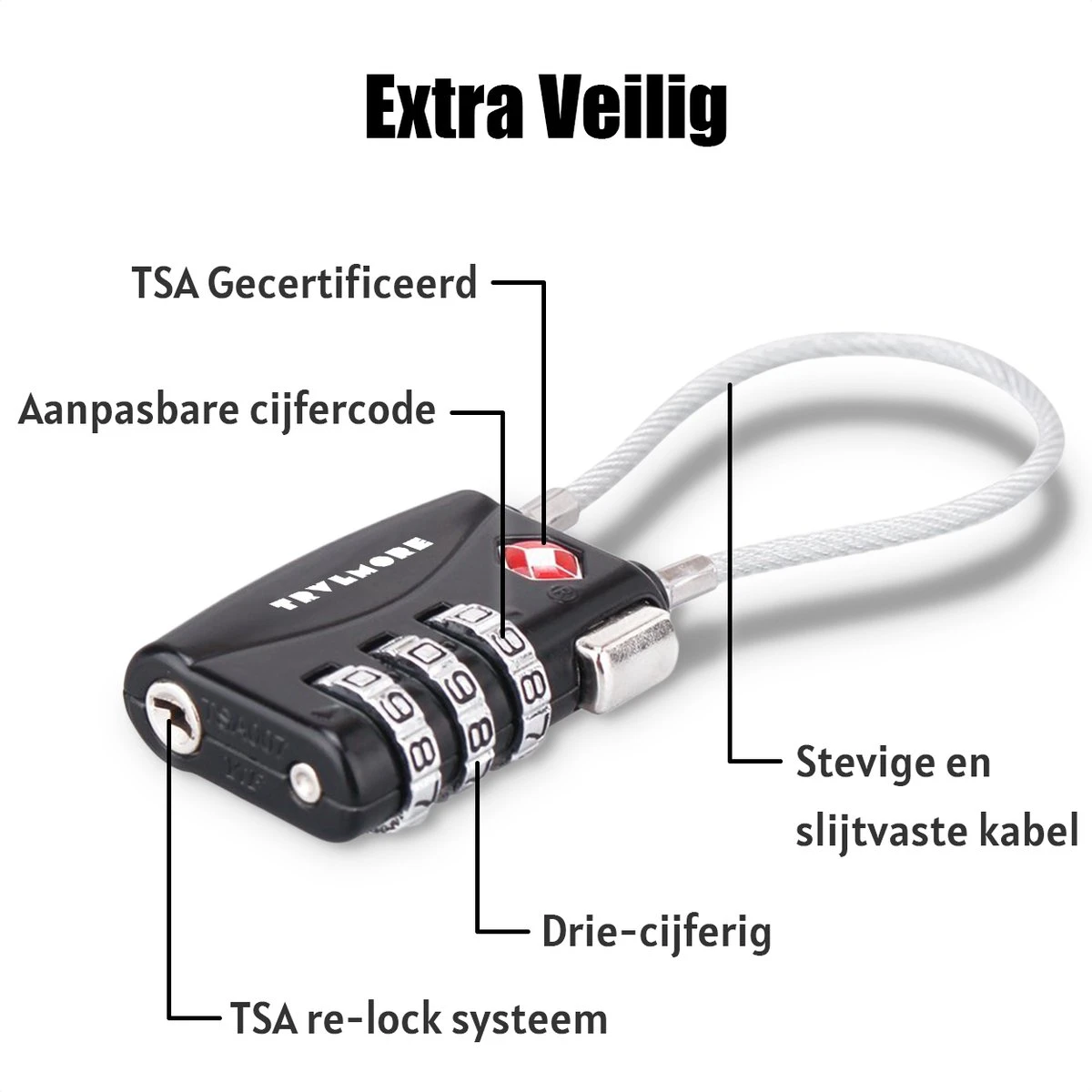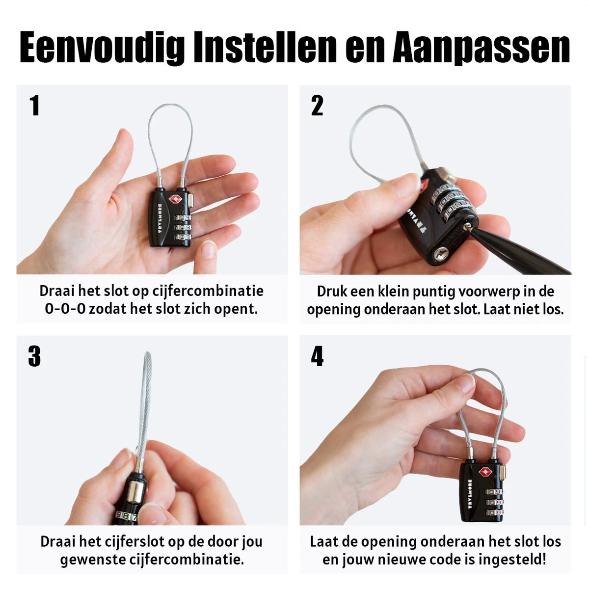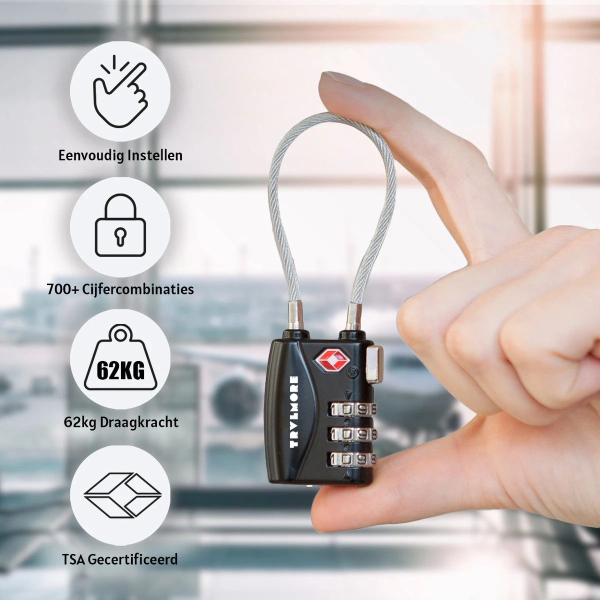 Het kabelslot beschikt over een 3-cijferige persoonlijke pincode die u zelf gemakkelijk kunt invoeren met behulp van de bijgeleverde instructie. De cijfers van het slot zijn makkelijk leesbaar en slijtvast. Het kabelslot is geschikt voor TSA inspectie door Amerikaanse veiligheidsagenten en heeft een TSA certificaat. Dit kabelslot biedt beveiliging voor uw koffer en bagage op reis en is getest door duizenden tevreden reizigers.