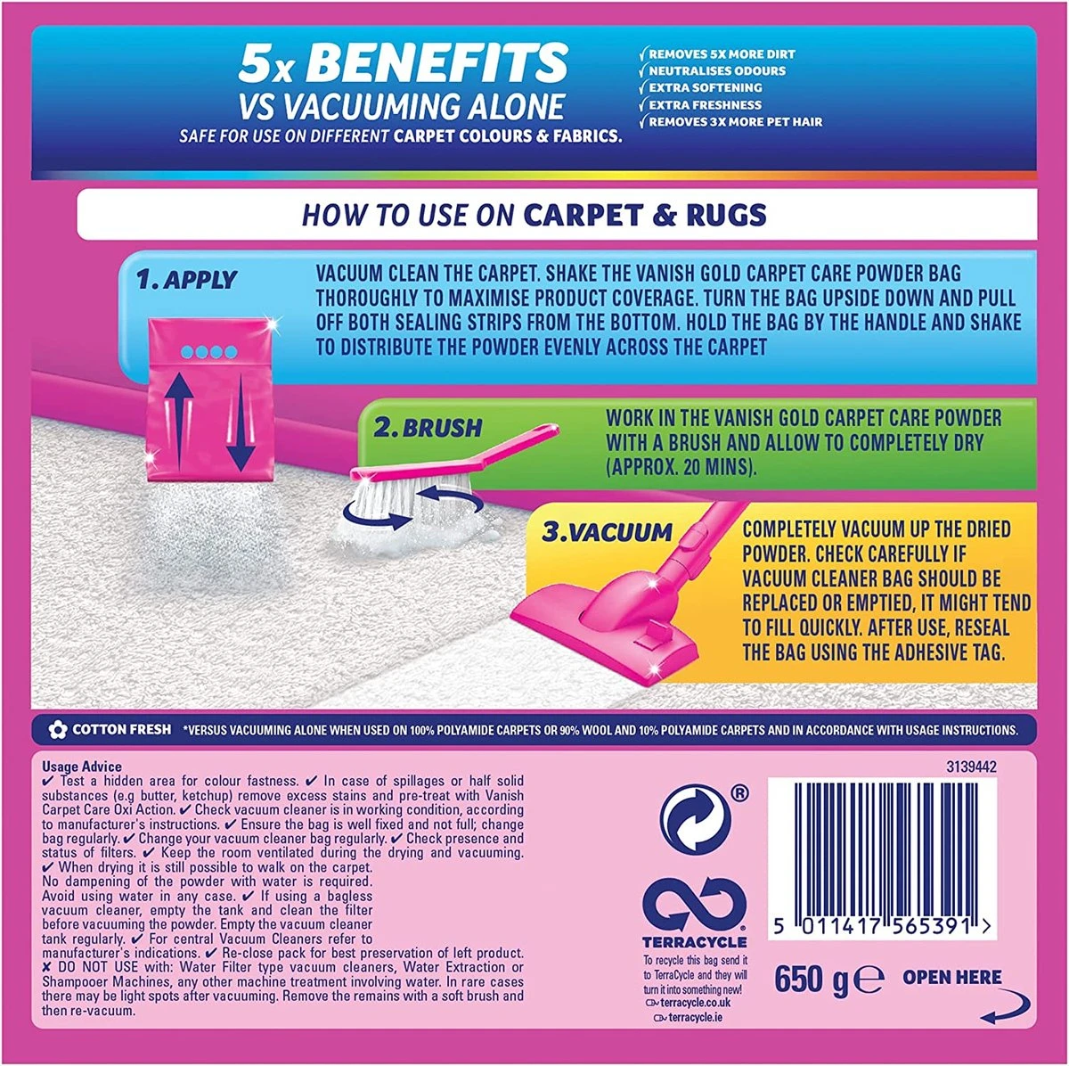 Vanish Tapijt Vlekverwijderaar Poeder verwijdert zelfs de meest hardnekkige vlekken uit tapijt en vloerbedekking. Geeft direct een fantastisch resultaat en is geschikt voor grote oppervlakken. Het poeder Carpet Gold 500g biedt 5 keer meer voordelen dan een eenvoudig stofzuigbeurt, uw tapijten en matten zien eruit als nieuw. Dit is onze beste vlekverwijderende poeder voor tapijten en matten: