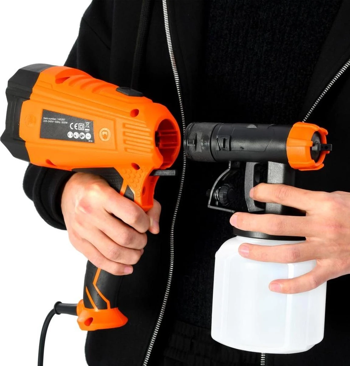 Waarom iemand anders inhuren om het schilderwerk te doen als je het zelf kunt doen? Onze gebruiksvriendelijke, elektrische verfspuit maakt het schilderen comfortabeler, eenvoudiger en sneller. Hij is geweldig voor het spuiten van deuren, ornamenten, meubelen, muren, enz.