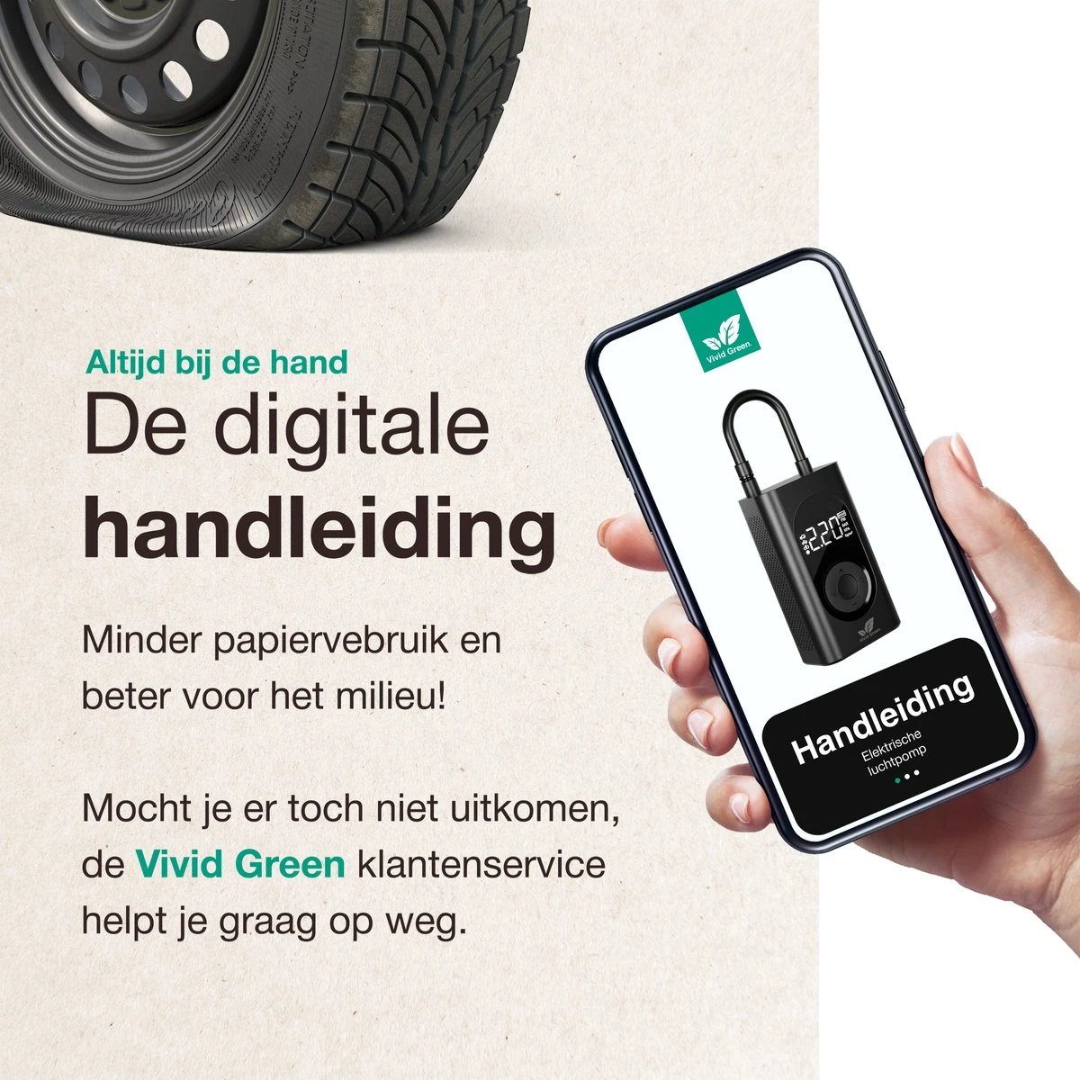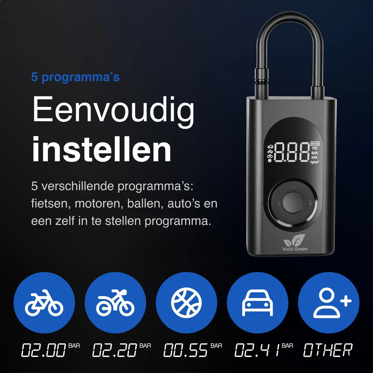 Zijn je banden op spanning? Niet? Pomp ze voortaan thuis makkelijk op met de Vivid Green elektrische fietspomp! Met verschillende opzetstukken en oplaadbare accu zet je jouw banden weer op de correcte spanning! Maar natuurlijk ook te gebruiken als voetbalpomp of als bandenpomp om benzinekosten en bandenslijtage te verlagen. En mocht je nu met pech langs de weg staan met een lege telefoon, de bandenpomp is ook te gebruiken als powerbank in geval van nood. Wel zo handig!