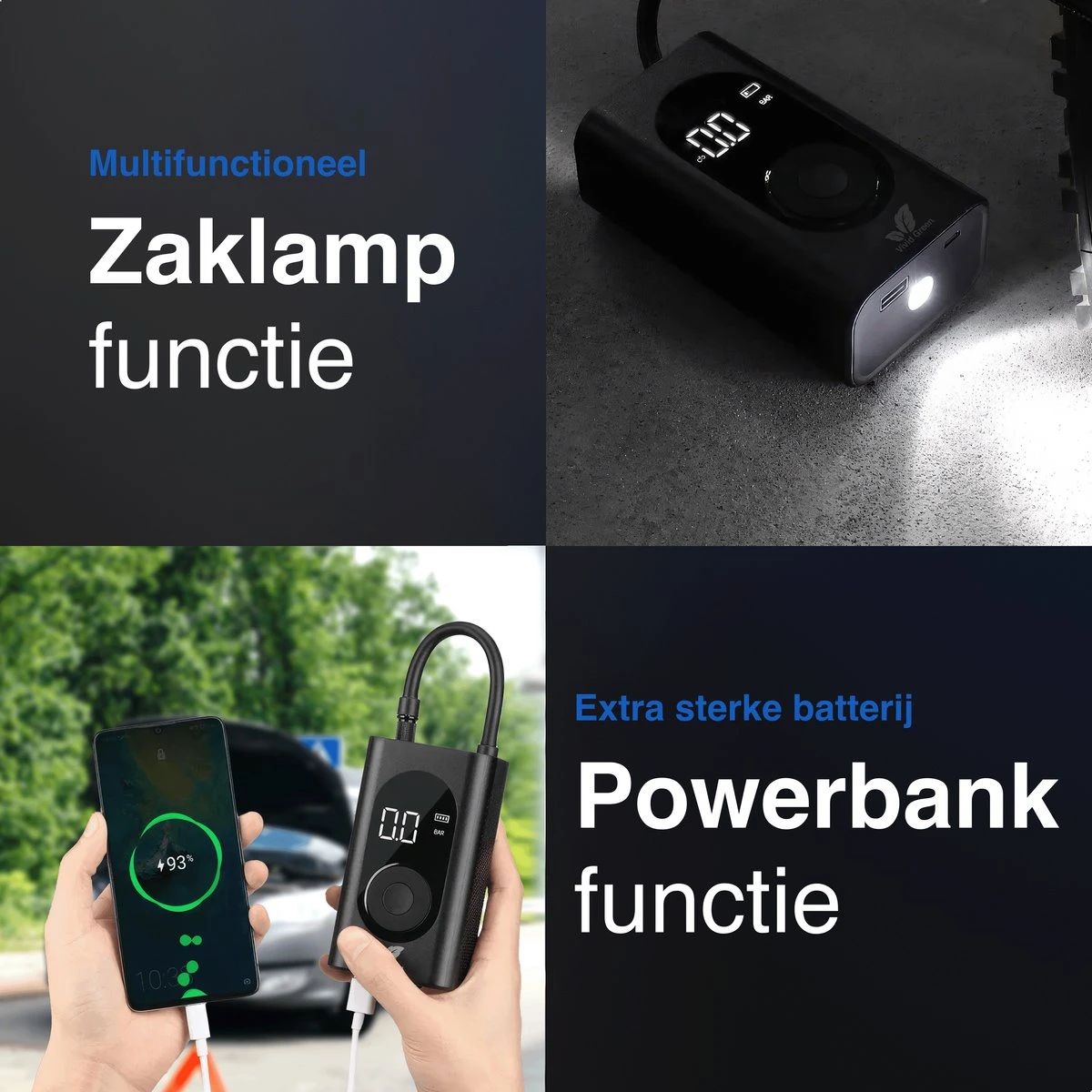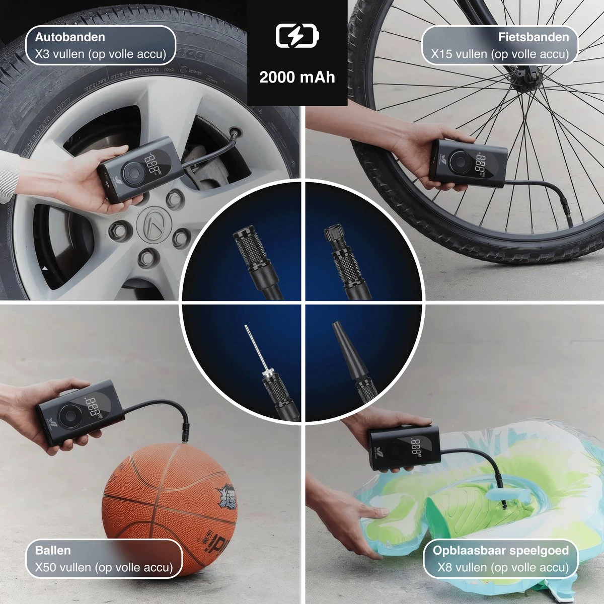 Geschikt voor: oppompen autobanden, fietsbanden, motorfietsbanden, scooterbanden ballen (basketbal, voetbal, etc.), opblaasartikelen (strandaccessoires, luchtbed, etc.) en opladen van telefoon, d.m.v. ingebouwde powerbank.