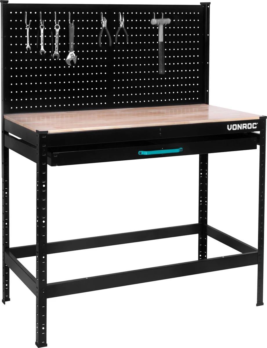 Zoek jij een werkbank waar je ook direct je materialen en gereedschappen in en/of op kunt bergen? Stop dan met zoeken, deze werkbank is de perfecte aanwinst! Deze werkbank van VONROC kan gebruikt worden voor al je klussen of hobbyklussen in je schuur, in je garage of andere werkplekken. Je kunt er niet alleen aan werken, maar het is dus ook mogelijk om er gereedschap in op te bergen of om handgereedschap op te hangen middels de meegeleverde 15-delige hakenset.