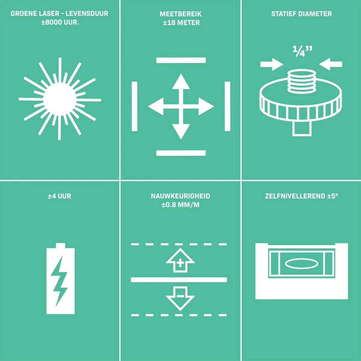 - Zelfnivellerende kruislijnlaser groen met een nauwkeurigheid van +/- 0,8 mm per meter.