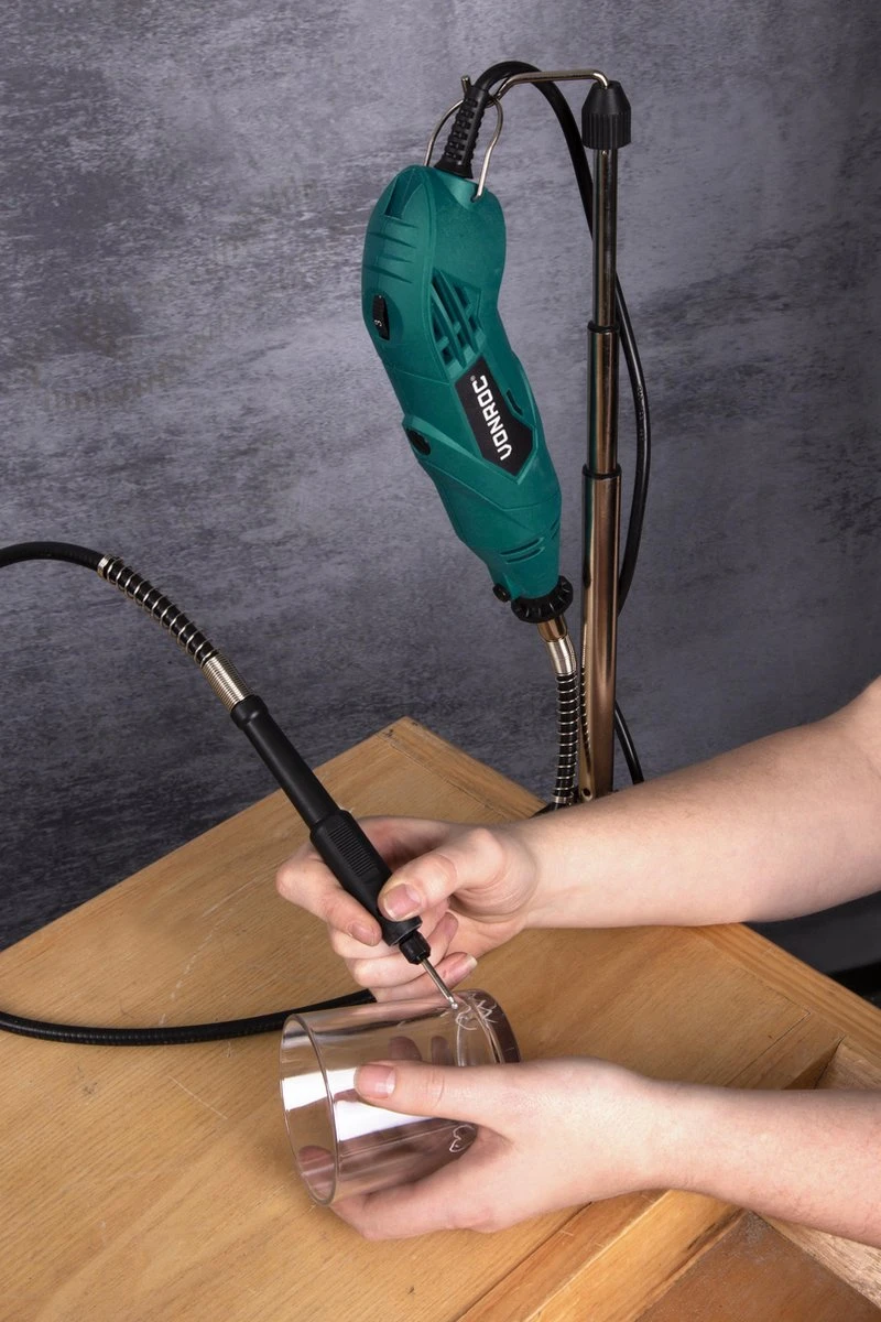 In het pakket vind je verder nog een bescherm kap, welke extra bescherming biedt bij het slijpen en snijden van metalen en een handig graveer/frees hulpstuk. Dit hulpstuk helpt jou om tijdens het frezen/graveren de machine recht op het te bewerken materiaal te houden.