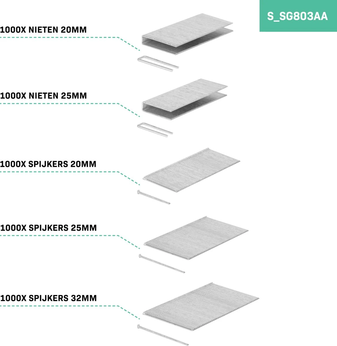 De set nieten en spijkers (S_SG803AA) worden geleverd in een milieuvriendelijke bruine doos zonder full colour opdruk.