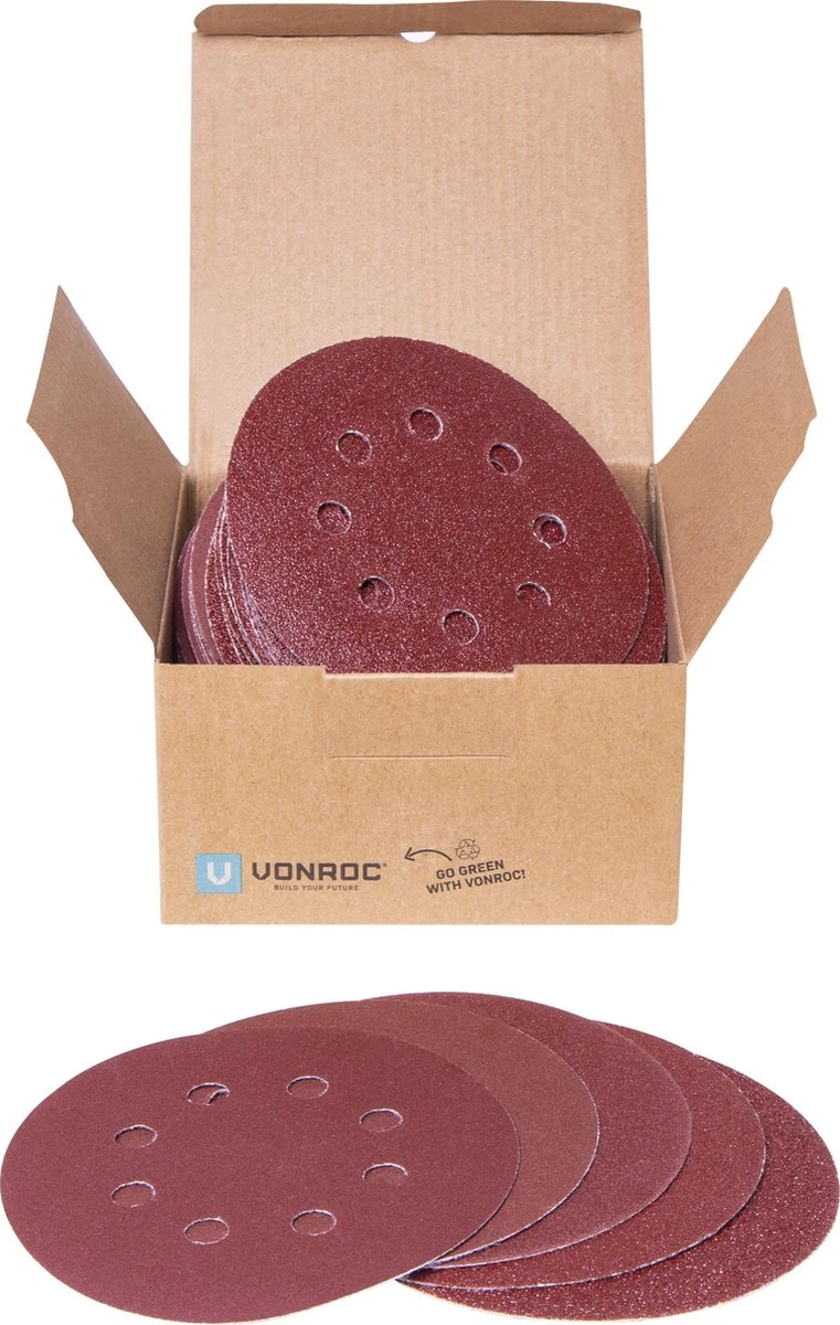 Met deze 50-delige set rond schuurpapier van VONROC heb je altijd het juiste schuurpapier bij de hand voor bijna elke schuurklus! Het schuurpapier heeft een diameter van 125mm en is voorzien van perforatiegaten, dit zorgt ervoor dat het stof vrijwel direct wordt opgezogen door de aangesloten stofzuiger en het voorkomt dat het stof gaat ronddwalen op je werkplek.
