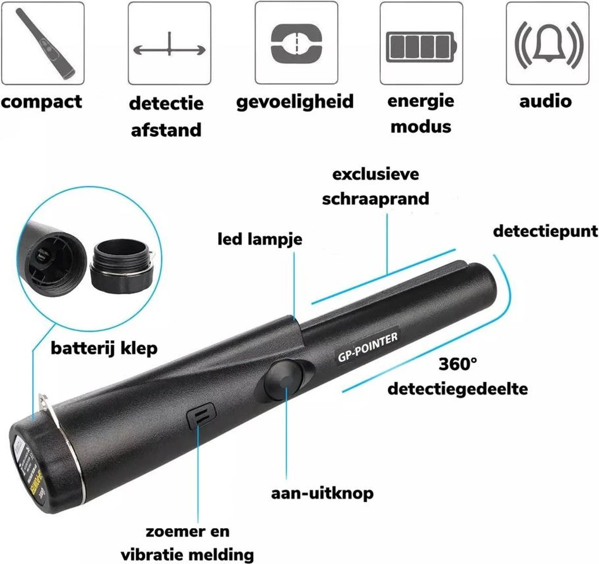 U kunt de GP pointer overal makkelijk mee naartoe nemen enorm voordeel van zo kleine pinpointer u ontvangt er ook een holster bij zodat u hem altijd makkelijk weg kan stoppen. Hou er rekening mee de GP pointer is niet volledig waterdicht alleen het voorstuk waar u alles mee waarneemt kan tegen water dus let aub op!!