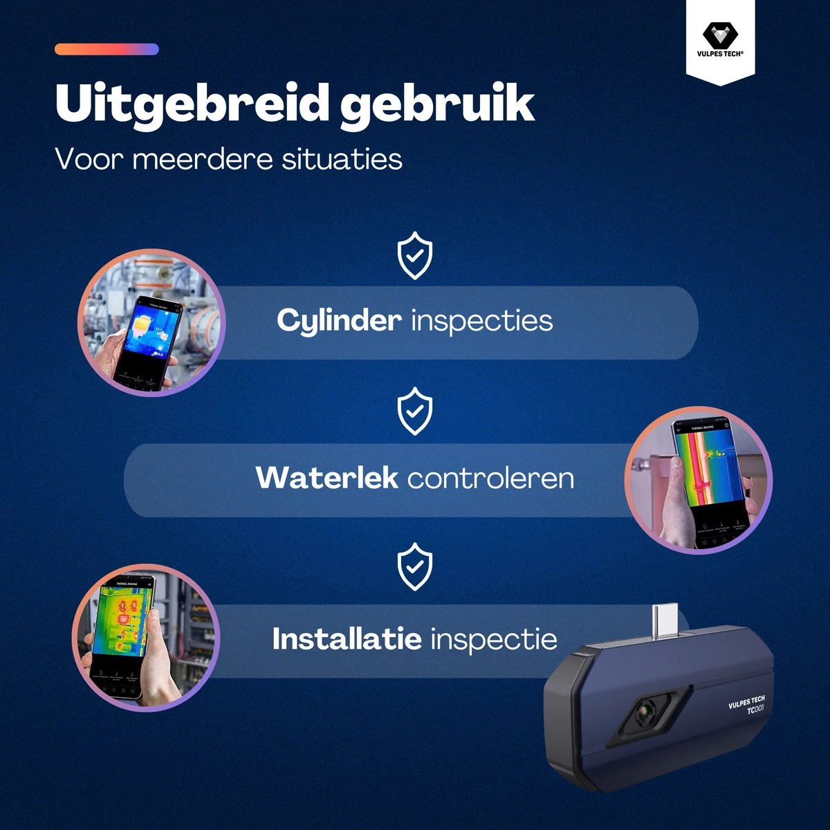 Zo kun je met de camera gemakkelijk een waterlek controleren, cilinder inspecties doen en installaties van apparaten inspecteren.