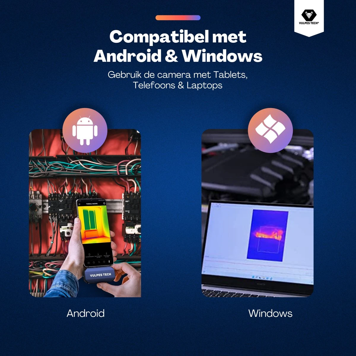 De warmtebeeldcamera van Vulpes Tech® kun je gebruiken met apparaten van Android en van Windows, zoals smartphones, tablets & laptops. Dit maakt de camera eenvoudig in gebruik en erg gebruiksvriendelijk. Je kunt de camera via een USB-C poort inpluggen en je kunt hierna direct beginnen met het meten van objecten. Snel, eenvoudig en gebruiksvriendelijk, daar streven wij naar!