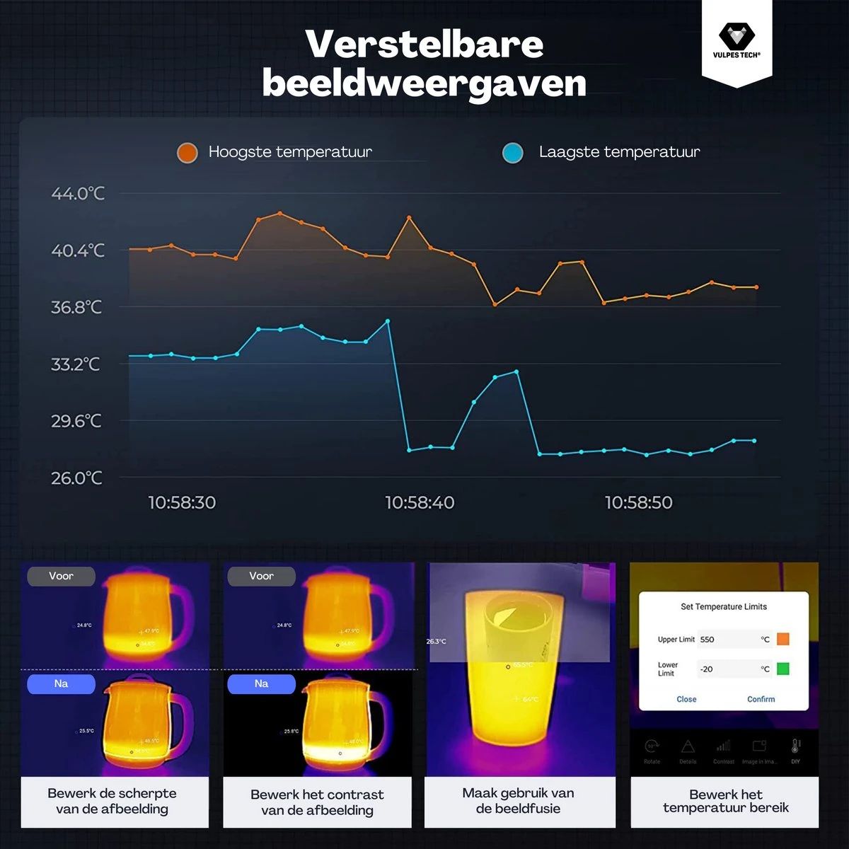 Dankzij het verbeterde bereik van -20 tot 550 graden Celsius kan de warmtebeeldcamera van Vulpes Tech® temperatuurmetingen uitvoeren met een nauwkeurigheid van 2 graden Celsius of 2% van de werkelijke temperatuur van het object en de temperatuur meten met een nauwkeurigheid van 0,1 graden Celsius. De warmtebeeldcamera kan continu metingen uitvoeren en een grafiek daarvan genereren met de hoge, lage en gemiddelde temperaturen van objecten. De metingen kun je direct zien op je smartphone!