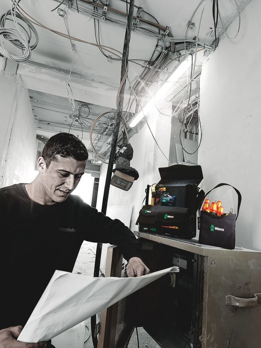 11 VDE geïsoleerde Kraftform schroevendraaiers met ‘Take it Easy’ gereedschapszoeker in vormvaste Wera 2go 4 kokers. Met instelbare ruimte-indeling voor individuele aanpassing.