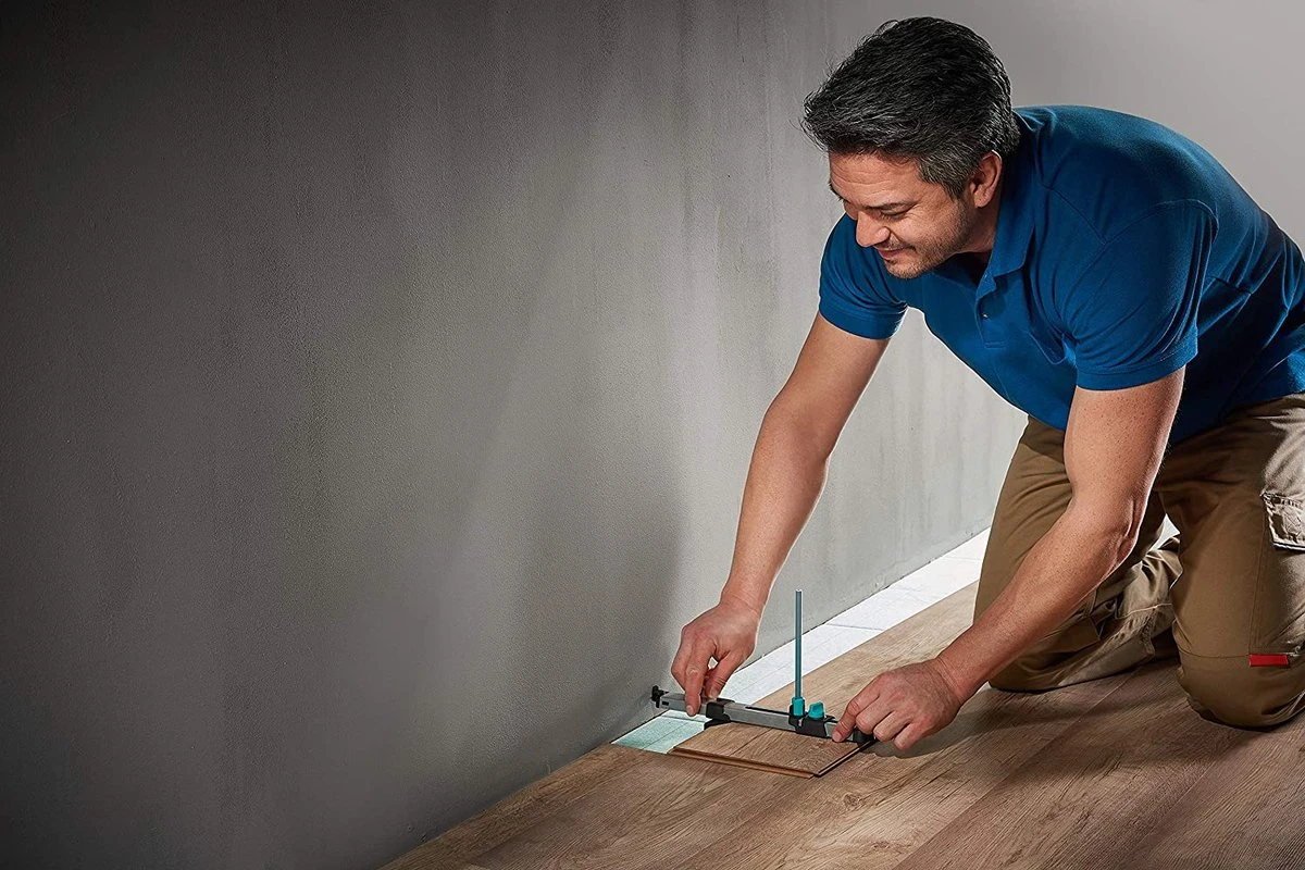 - Met deze drie hulpmiddelen in één praktische set kunt u alle uitdagingen aan voor het nauwkeurig inpassen van laminaat- en designvloeren