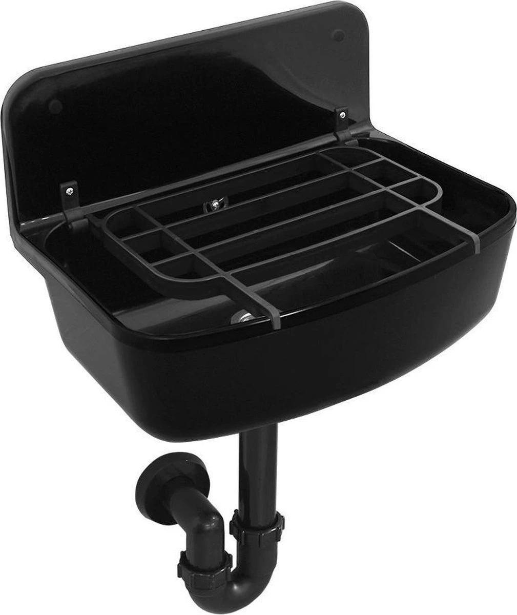 Kunststof uitstortgootsteen zwart (49 cm) met opklapbaar emmerrooster en sifon. Inclusief overloop, afvoerplug (6/4″) met stop, bevestigingsmateriaal.